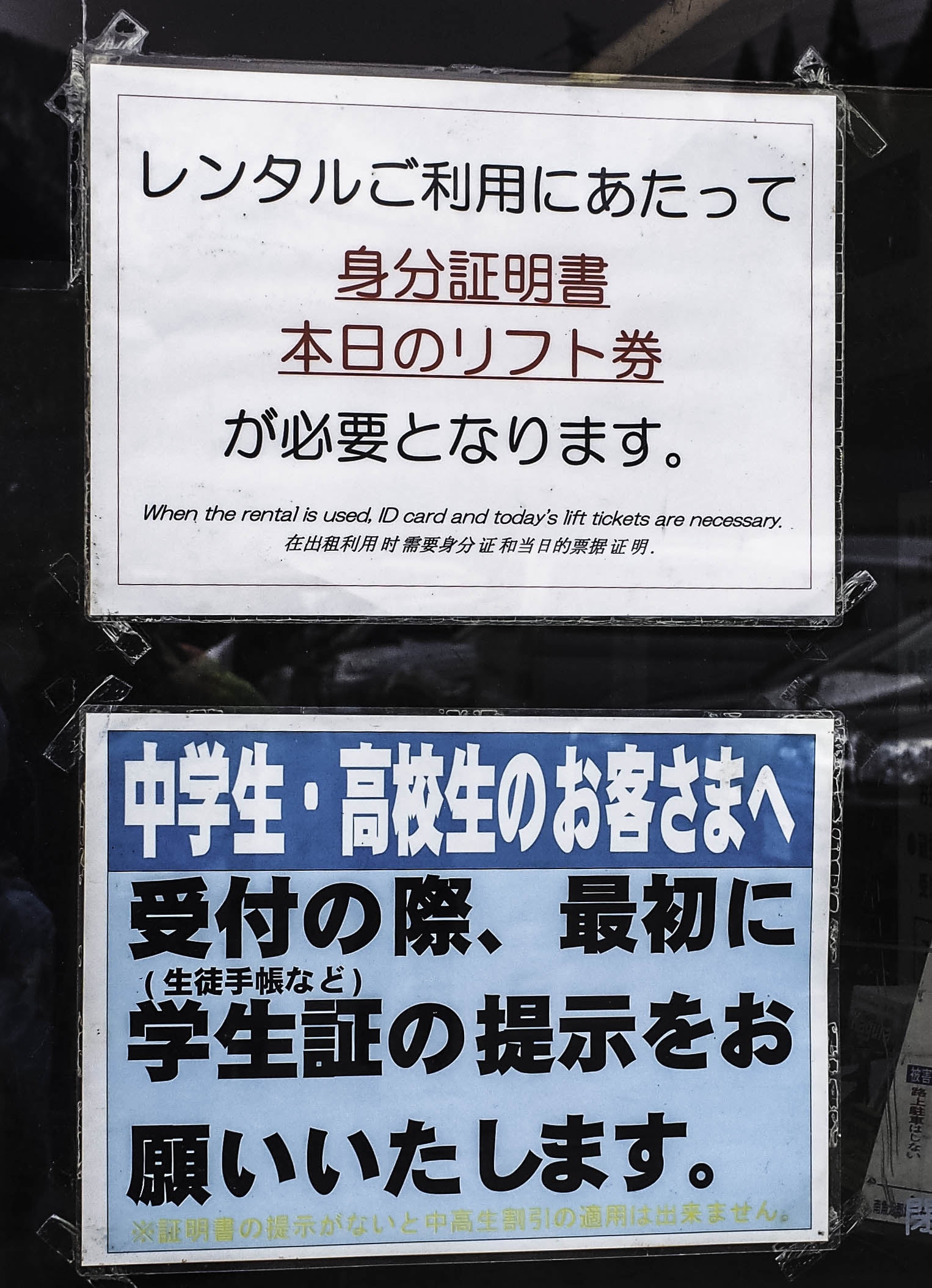 The first notice says: if you want to rent equipment, it is necessary to have your ID and ski lift pass. So we went to buy our ski pass first. The second notice says: students please show their students pass before payment (presumably to enjoy student rates).