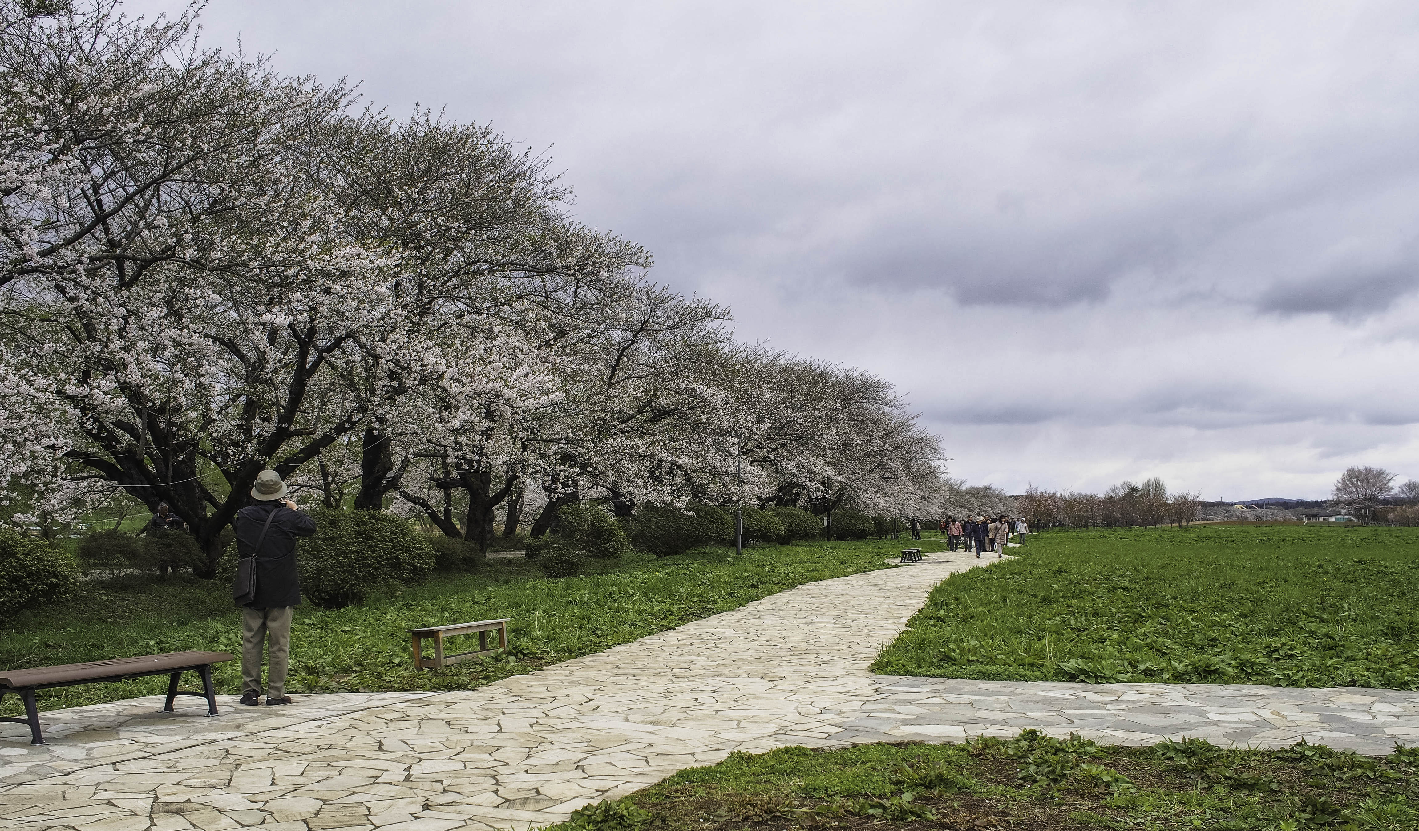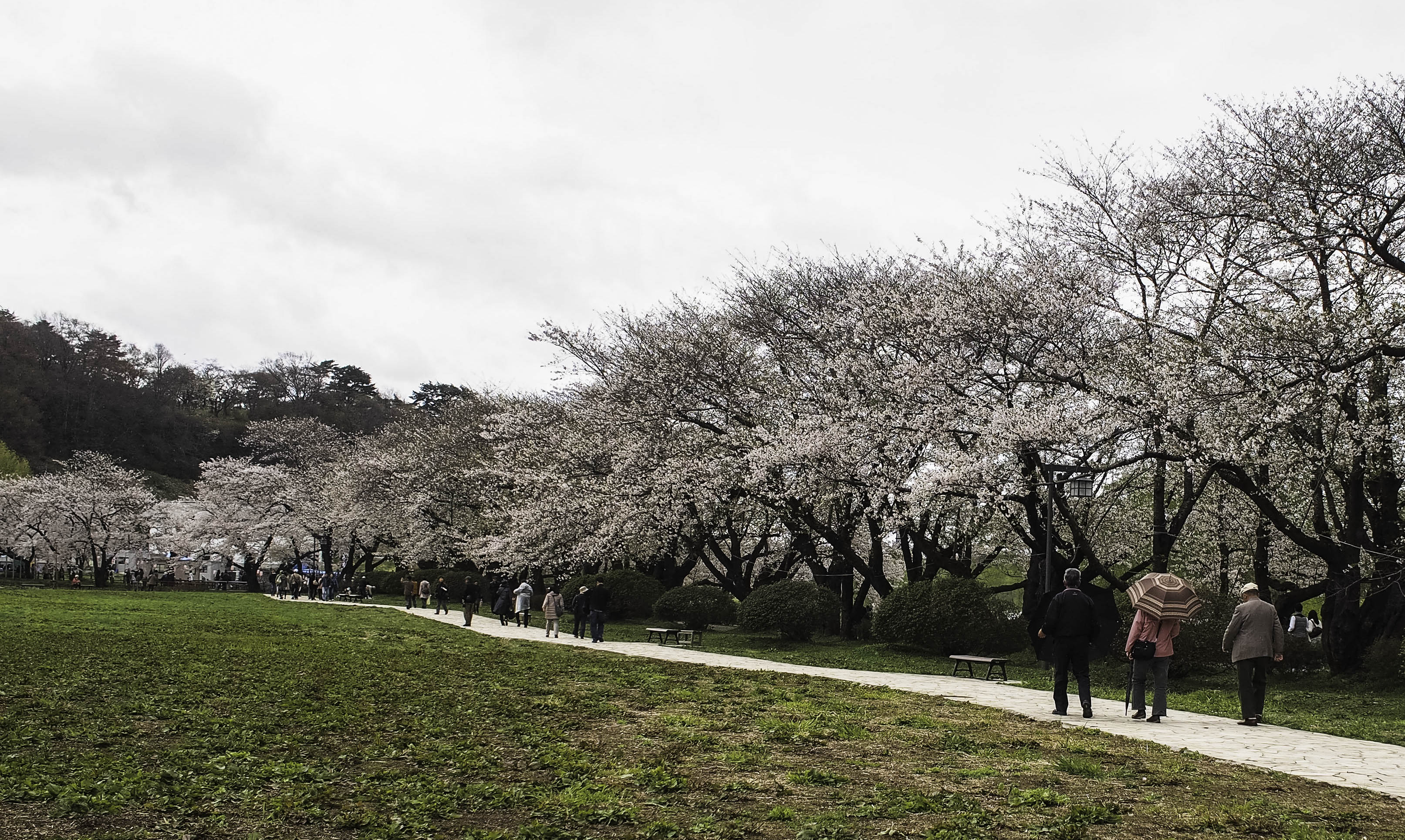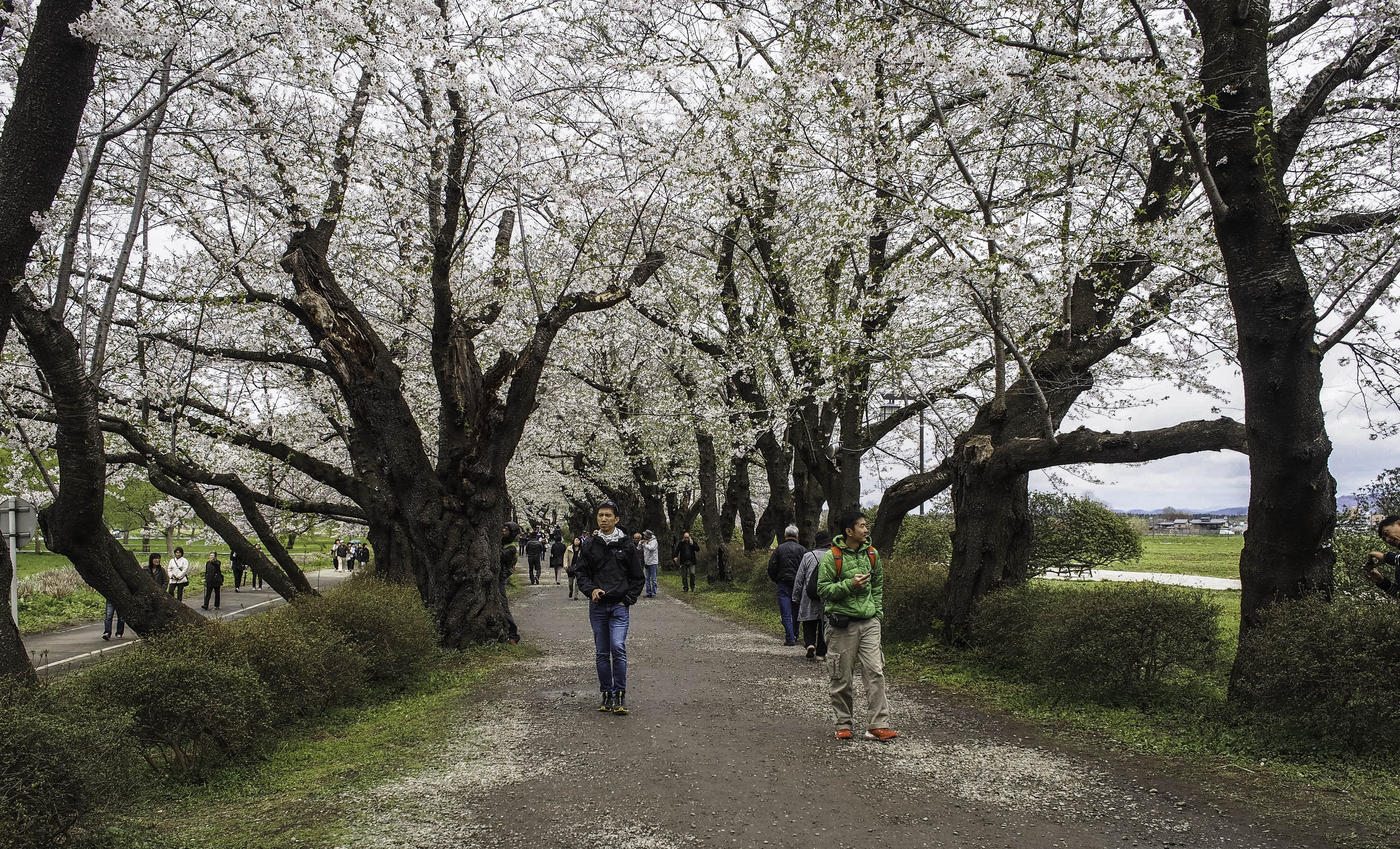 Our first stop was the Tensochi park at Kitakami. From the Iwate station, we took a train and then a bus to the park. It was drizzly and overcast but that didn’t deter a single tourist. I can assure you it was very crowded although you don’t see that many people in the photos below. Took me considerable time and skill to manoeuvre to positions where the crowds could be cropped out.