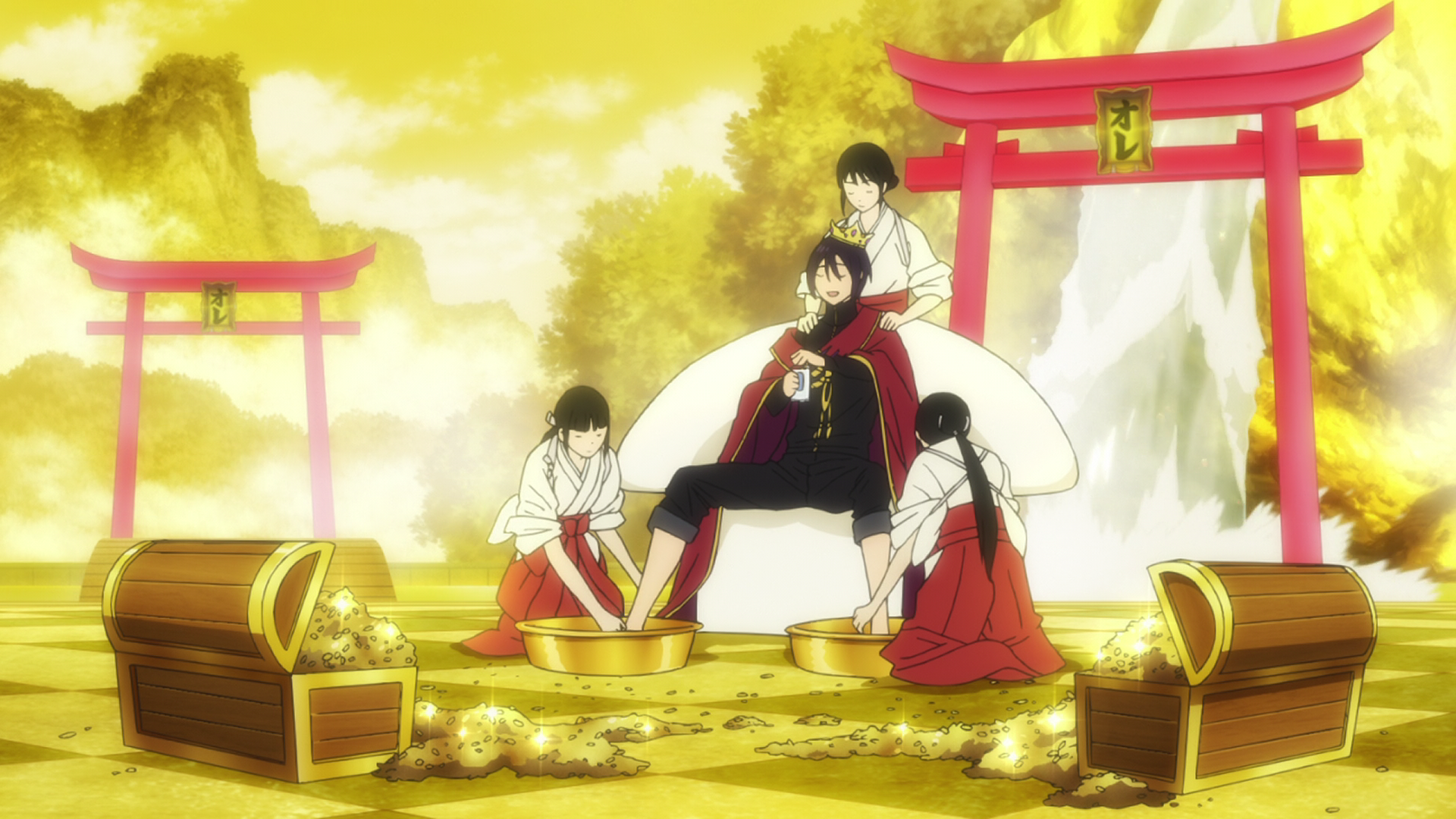 However, finding work is tough. And each job gets paid only 5 yen. (Somehow, they forgot to account for inflation). And poor Yato couldn’t fill his sake bottle with enough 5 yens coins yet.