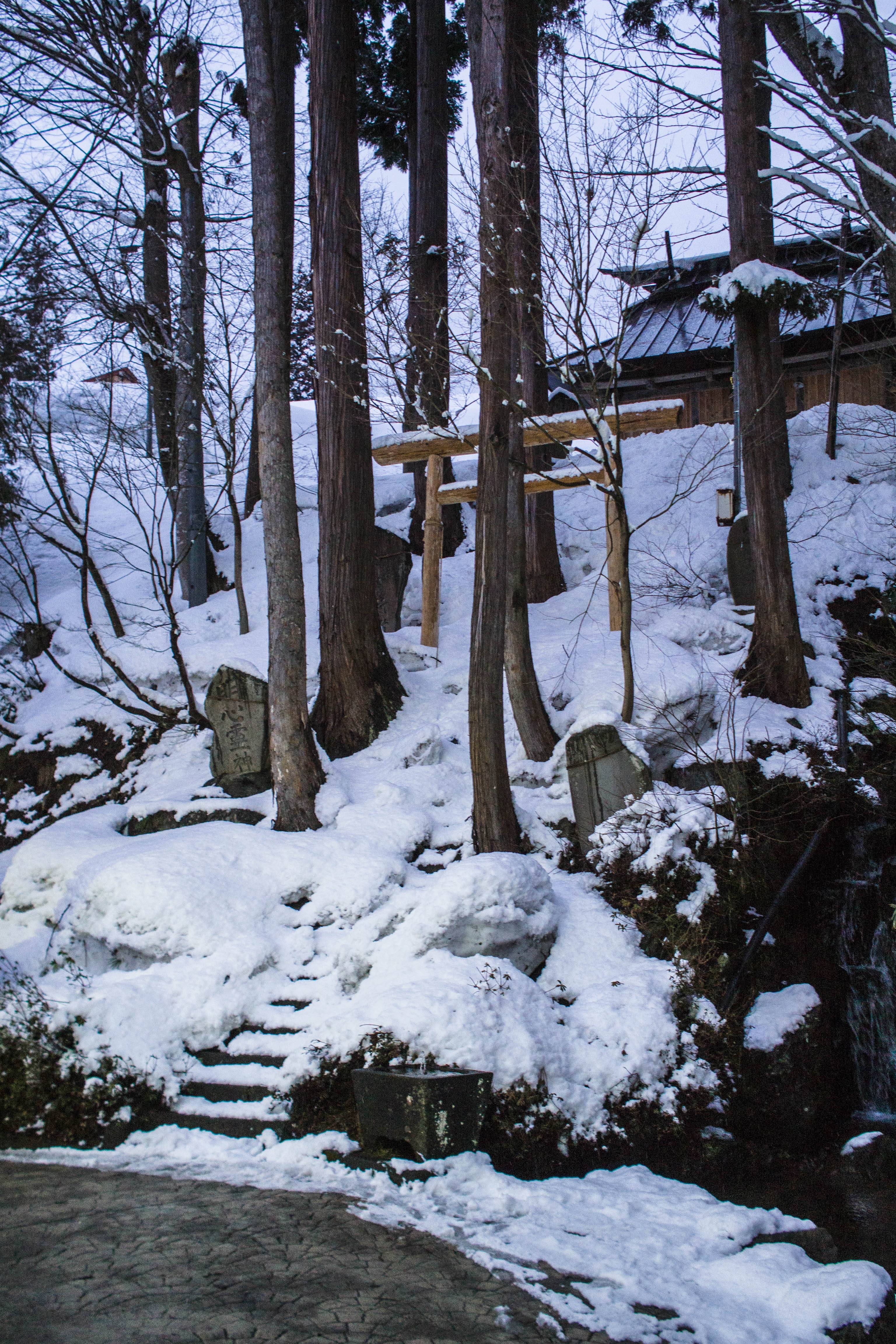 The shop engulfed in mist next to the Ogama hotspring (open-air hotspring next to the shrine but was under renovation), the snow-covered shrine, the lights from the shops lighting up the street, all lent a very atmospheric vibe to the town.