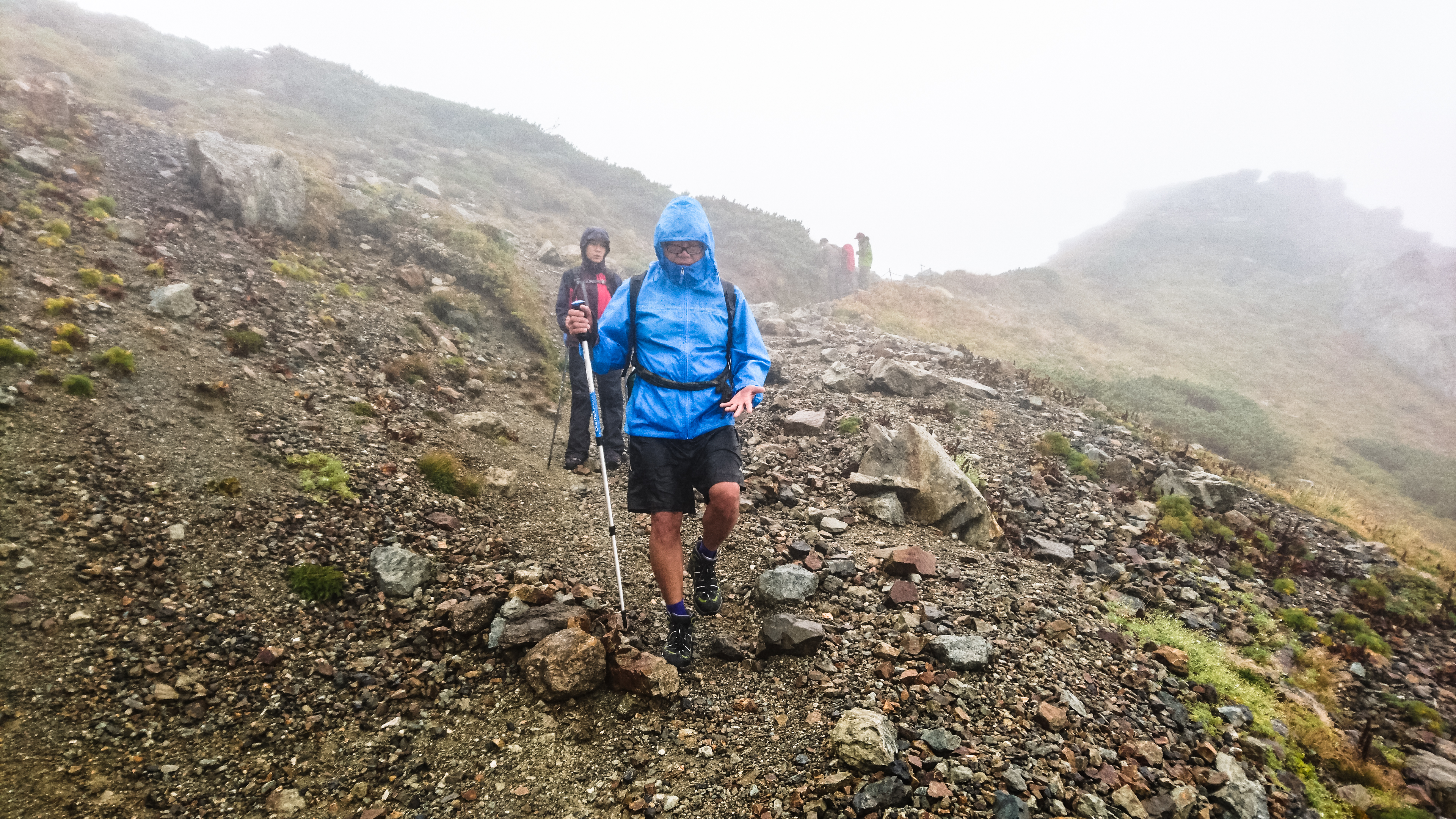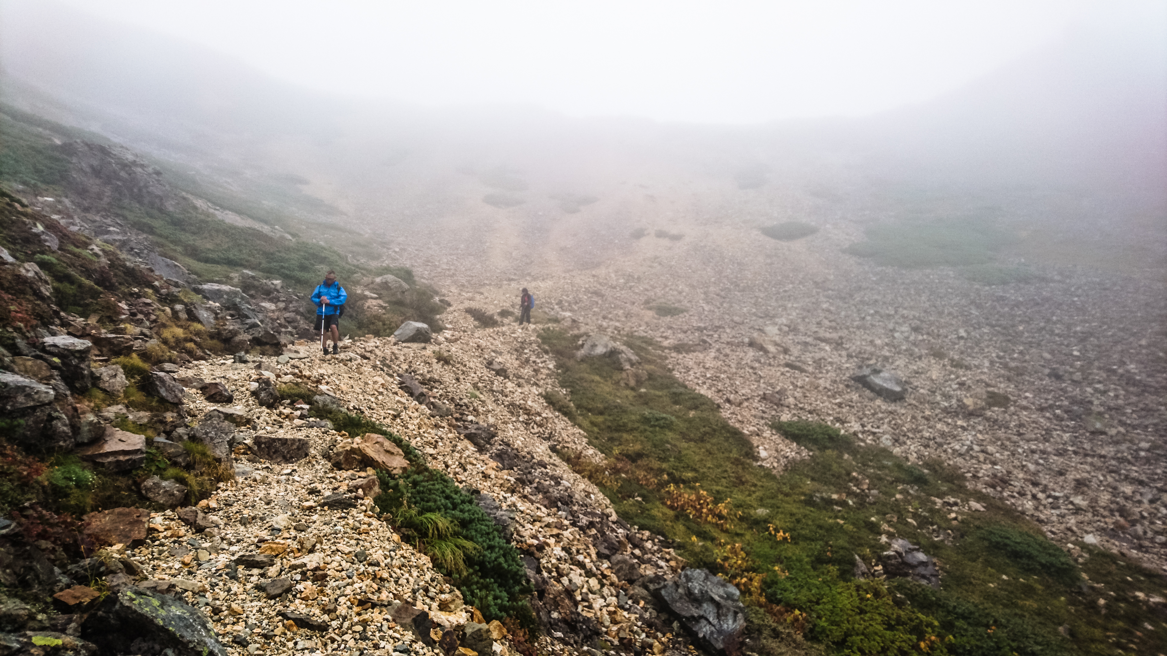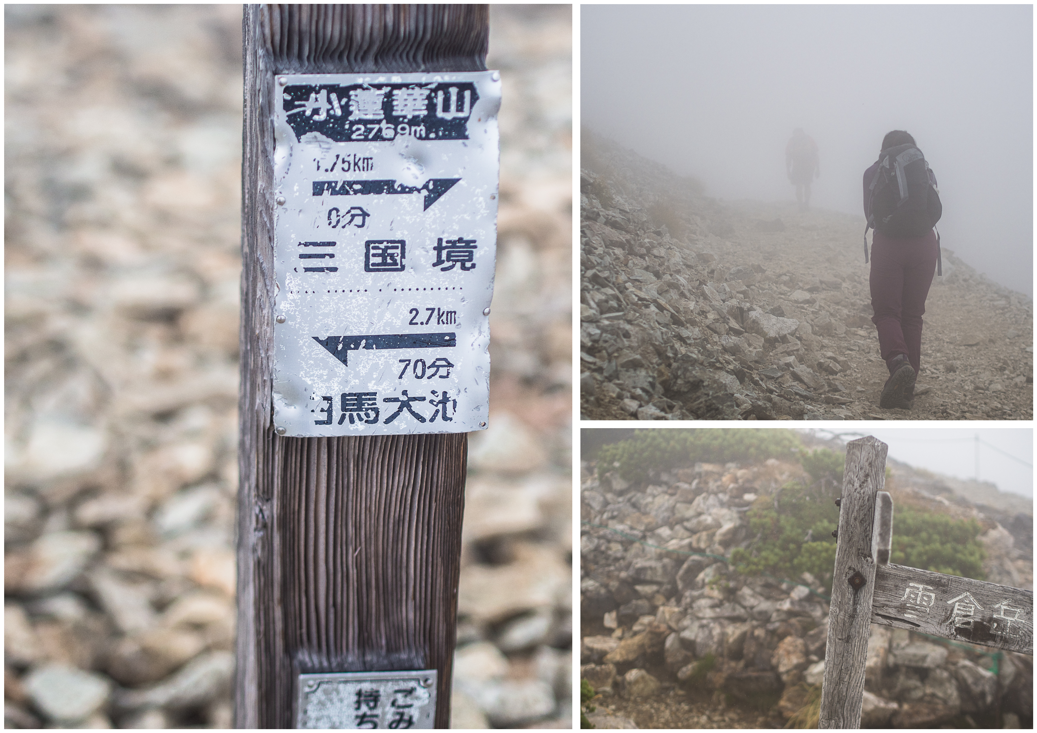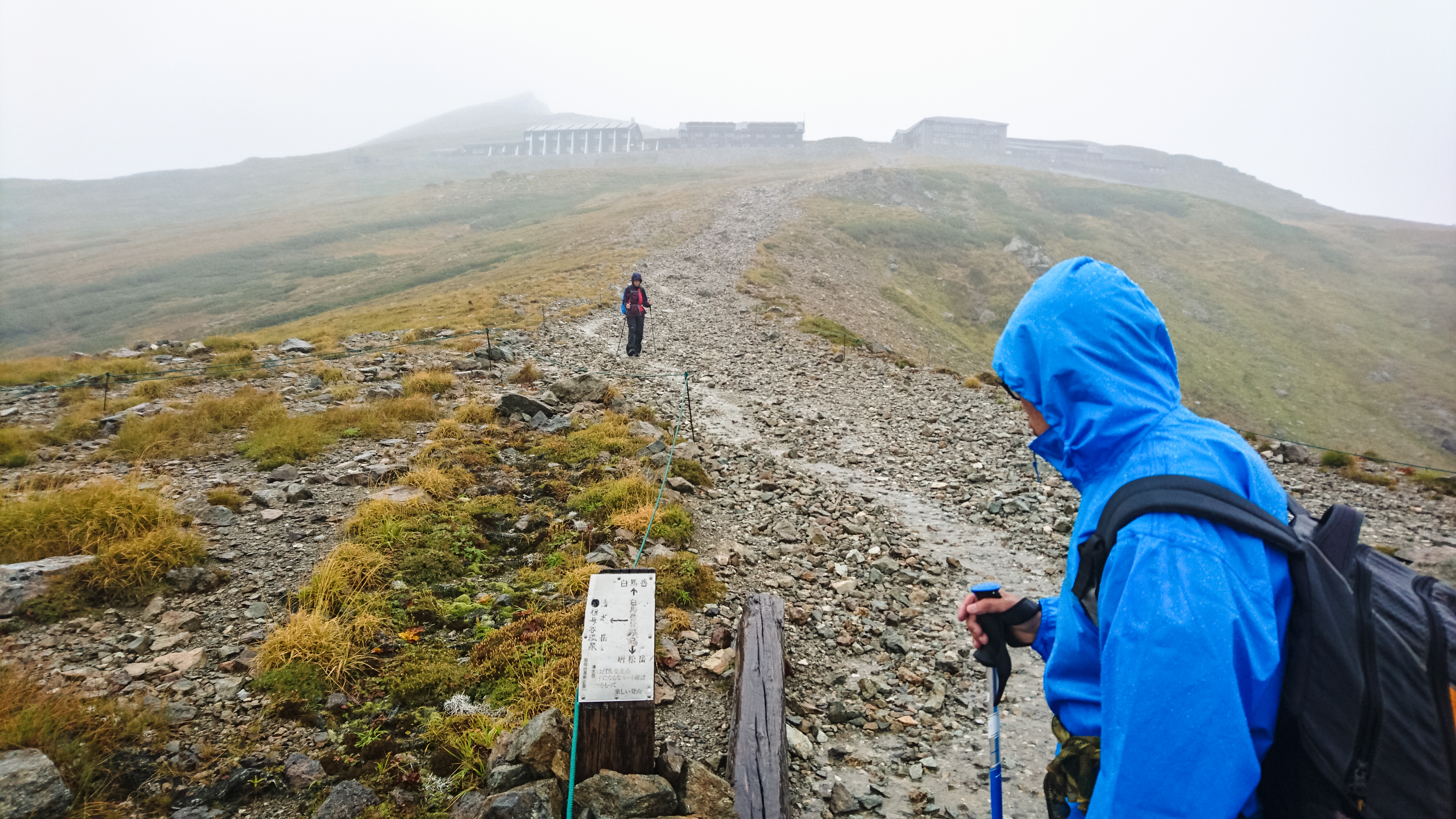 It was the worst, longest, 2 hours of the entire 3-day trek. The rain was bearable but the wind sheared right into the bones (even with heat packs), and there was no where to hide. We didn’t meet a single soul until about 1.5 hours into the trek near Shakushi Dake 杓子岳 (2812m). After that, the wind began to dance even more frenziedly around us and not long after, a group of hikers appeared. They had walked from Tengu Sanso 天狗山荘 – so we were not the only crazy chaps around here.