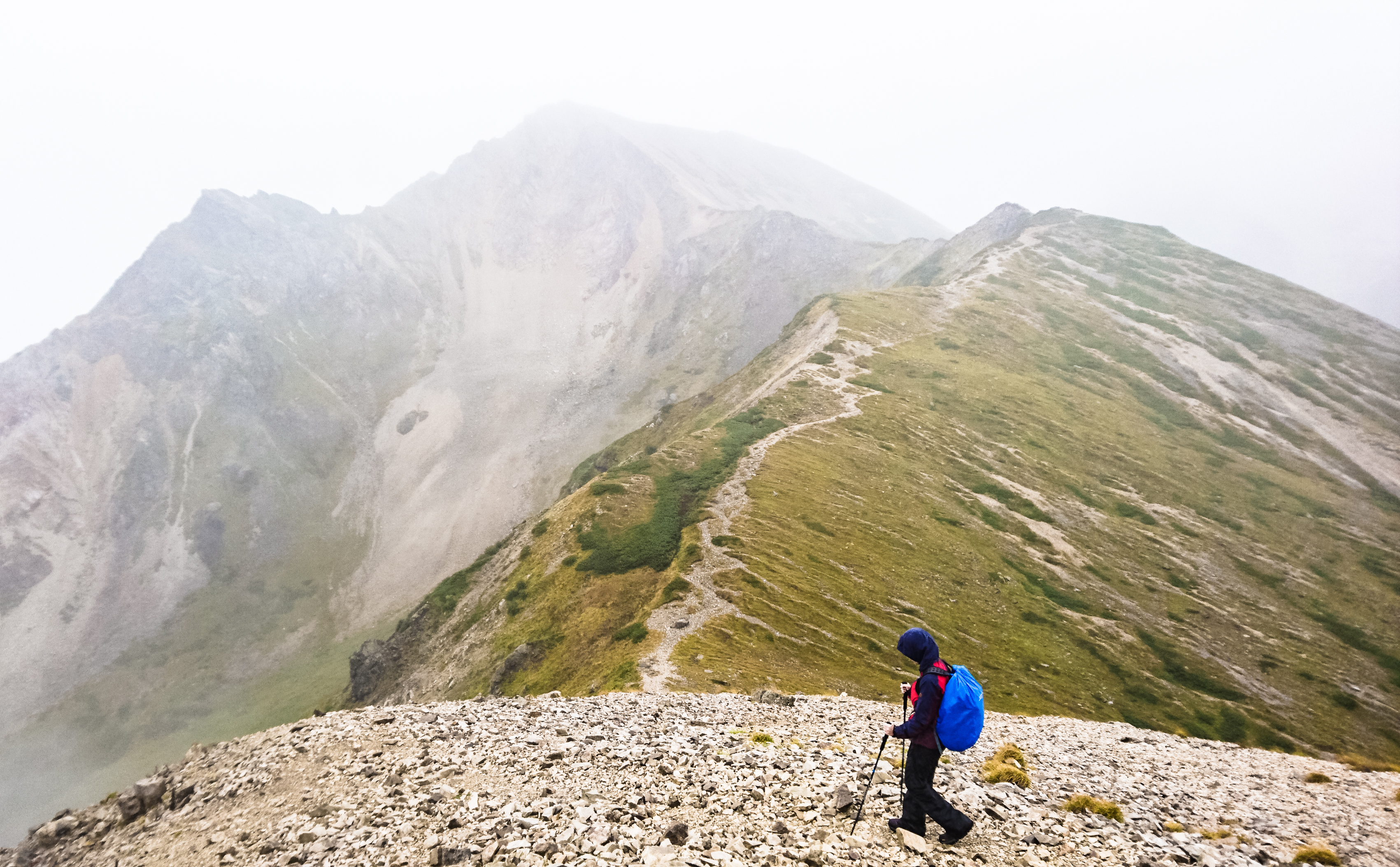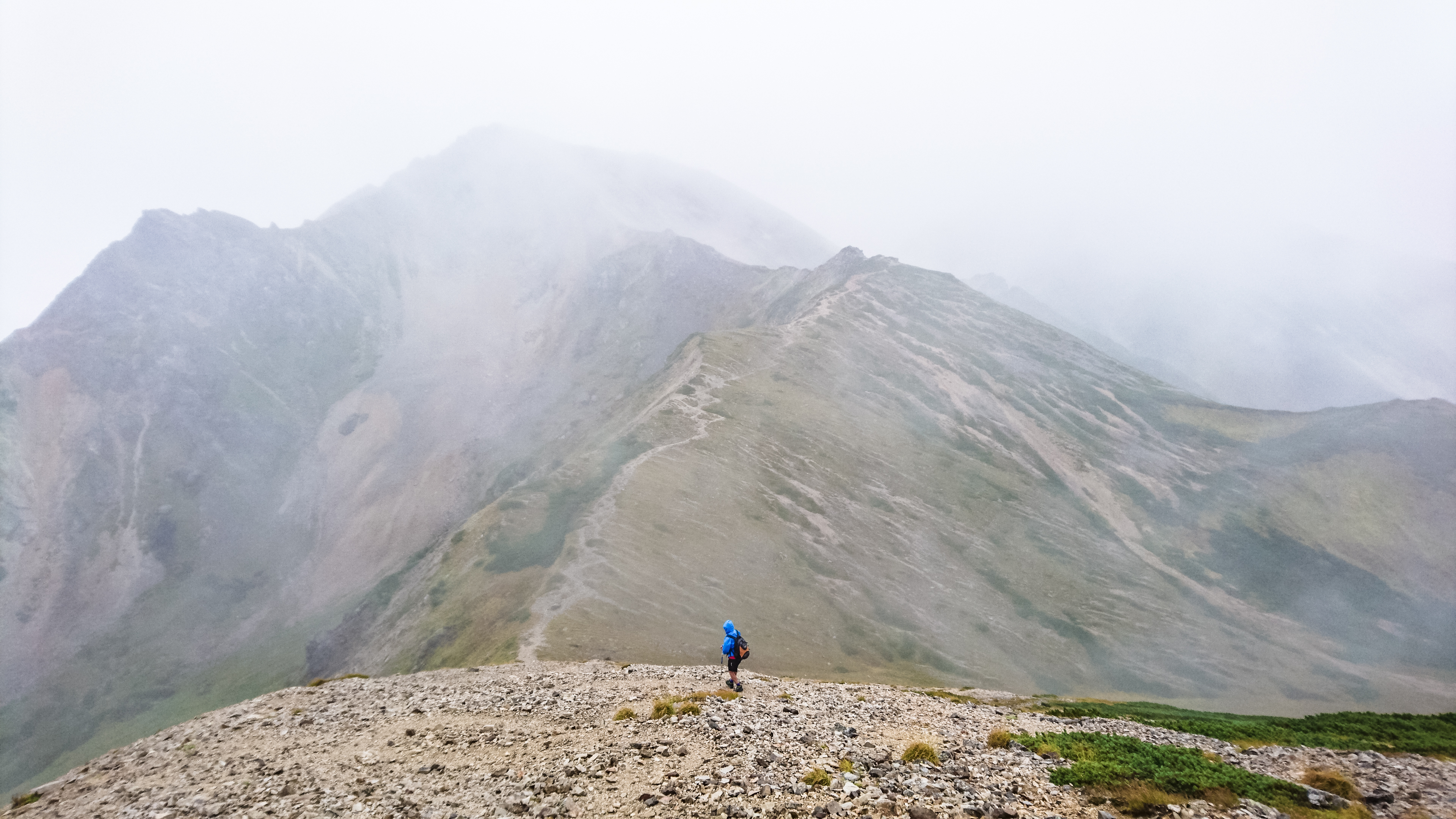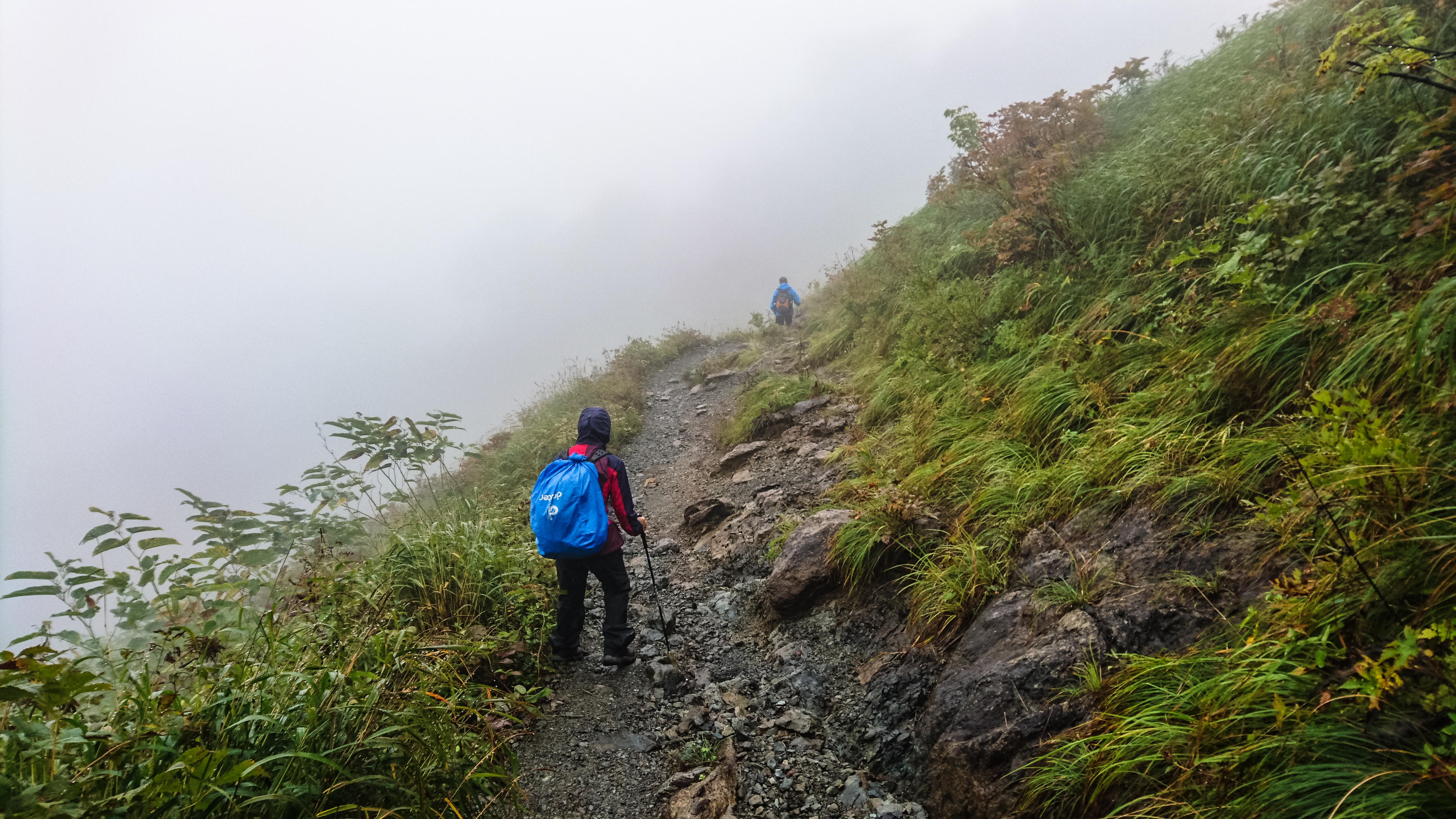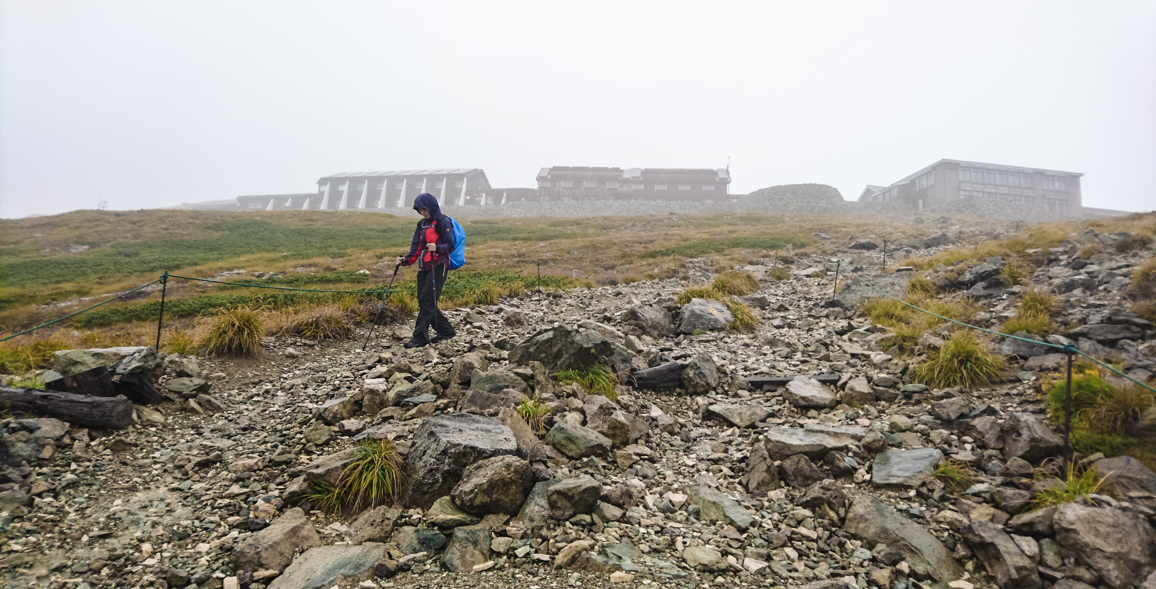 It was the worst, longest, 2 hours of the entire 3-day trek. The rain was bearable but the wind sheared right into the bones (even with heat packs), and there was no where to hide. We didn’t meet a single soul until about 1.5 hours into the trek near Shakushi Dake 杓子岳 (2812m). After that, the wind began to dance even more frenziedly around us and not long after, a group of hikers appeared. They had walked from Tengu Sanso 天狗山荘 – so we were not the only crazy chaps around here.