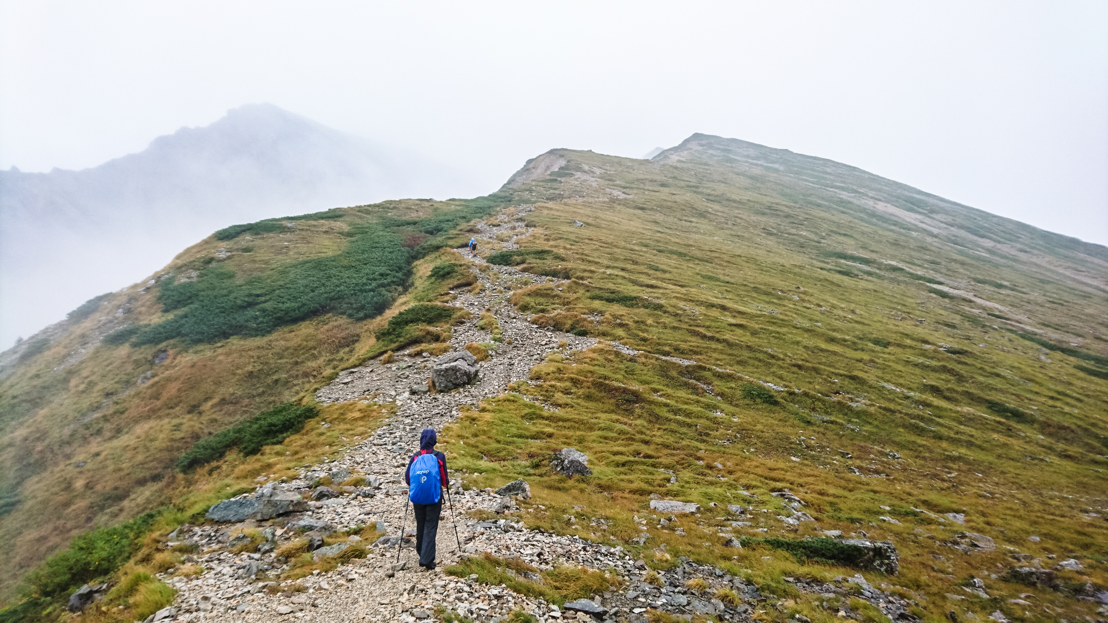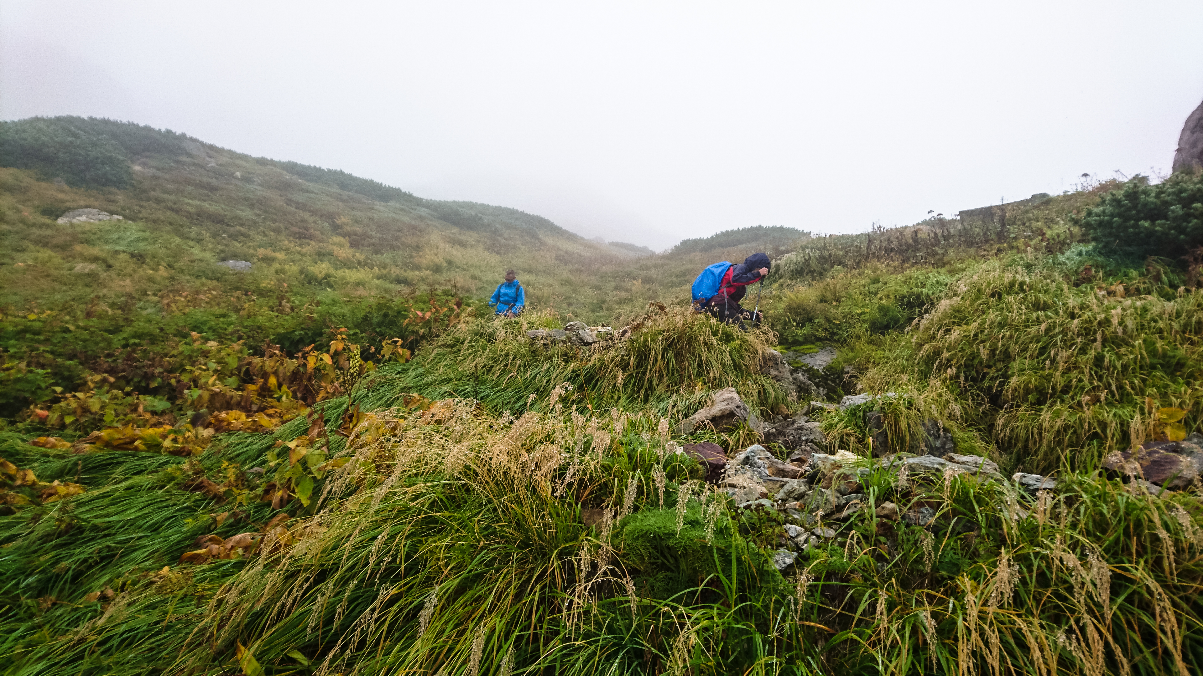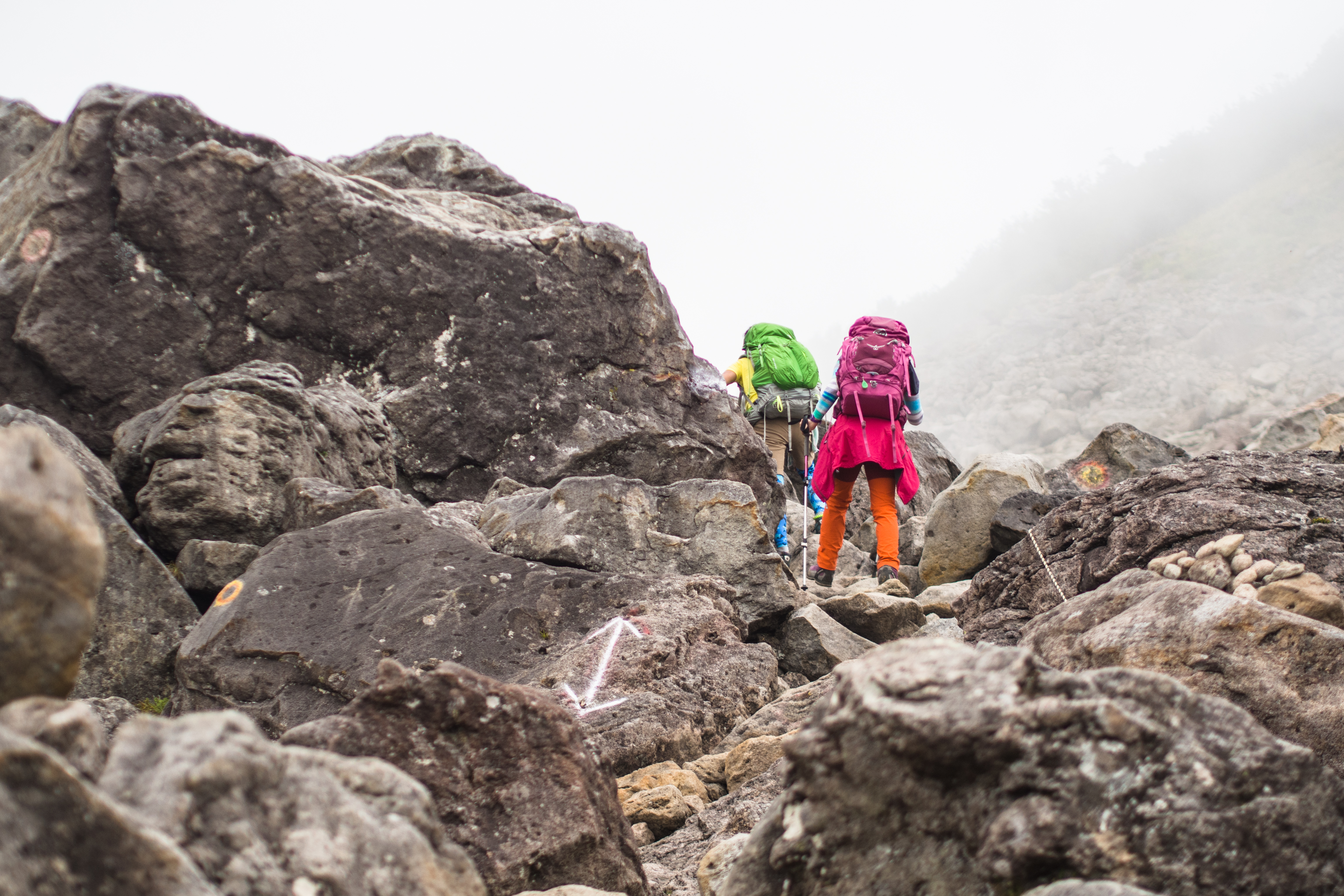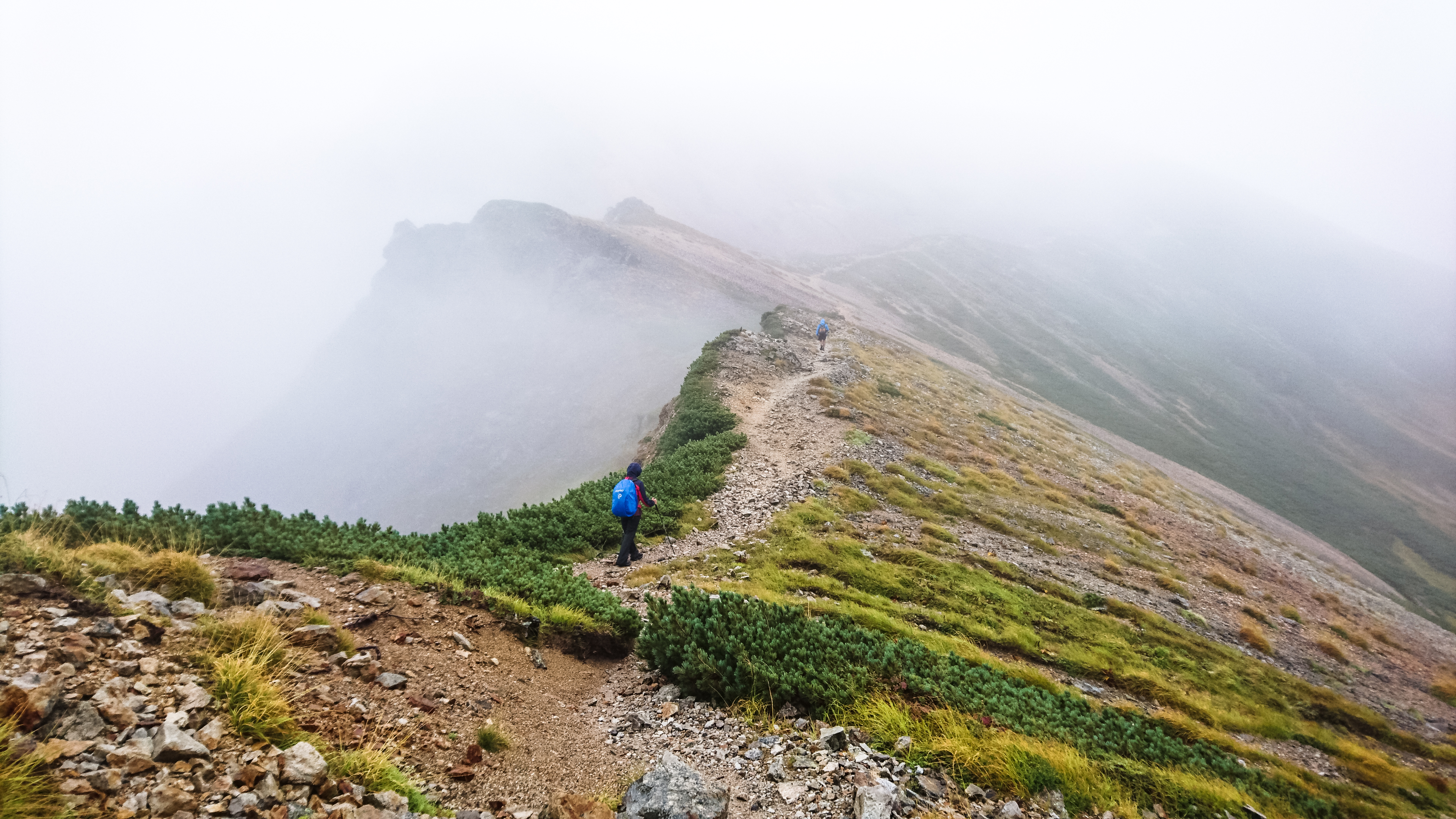 It was the worst, longest, 2 hours of the entire 3-day trek. The rain was bearable but the wind sheared right into the bones (even with heat packs), and there was no where to hide. We didn’t meet a single soul until about 1.5 hours into the trek near Shakushi Dake 杓子岳 (2812m). After that, the wind began to dance even more frenziedly around us and not long after, a group of hikers appeared. They had walked from Tengu Sanso 天狗山荘 – so we were not the only crazy chaps around here.