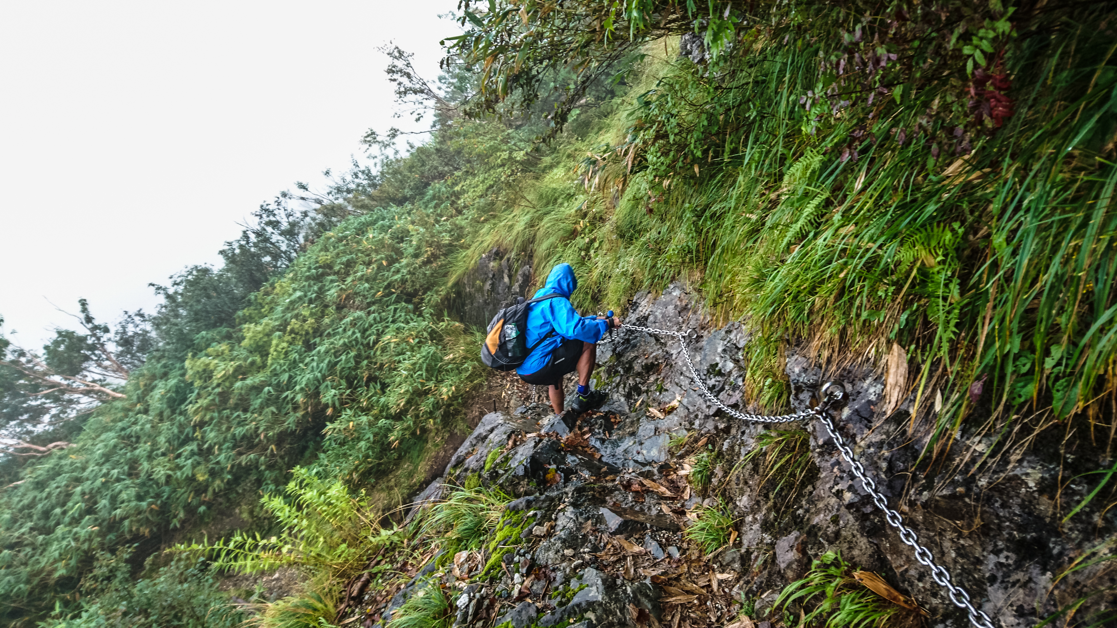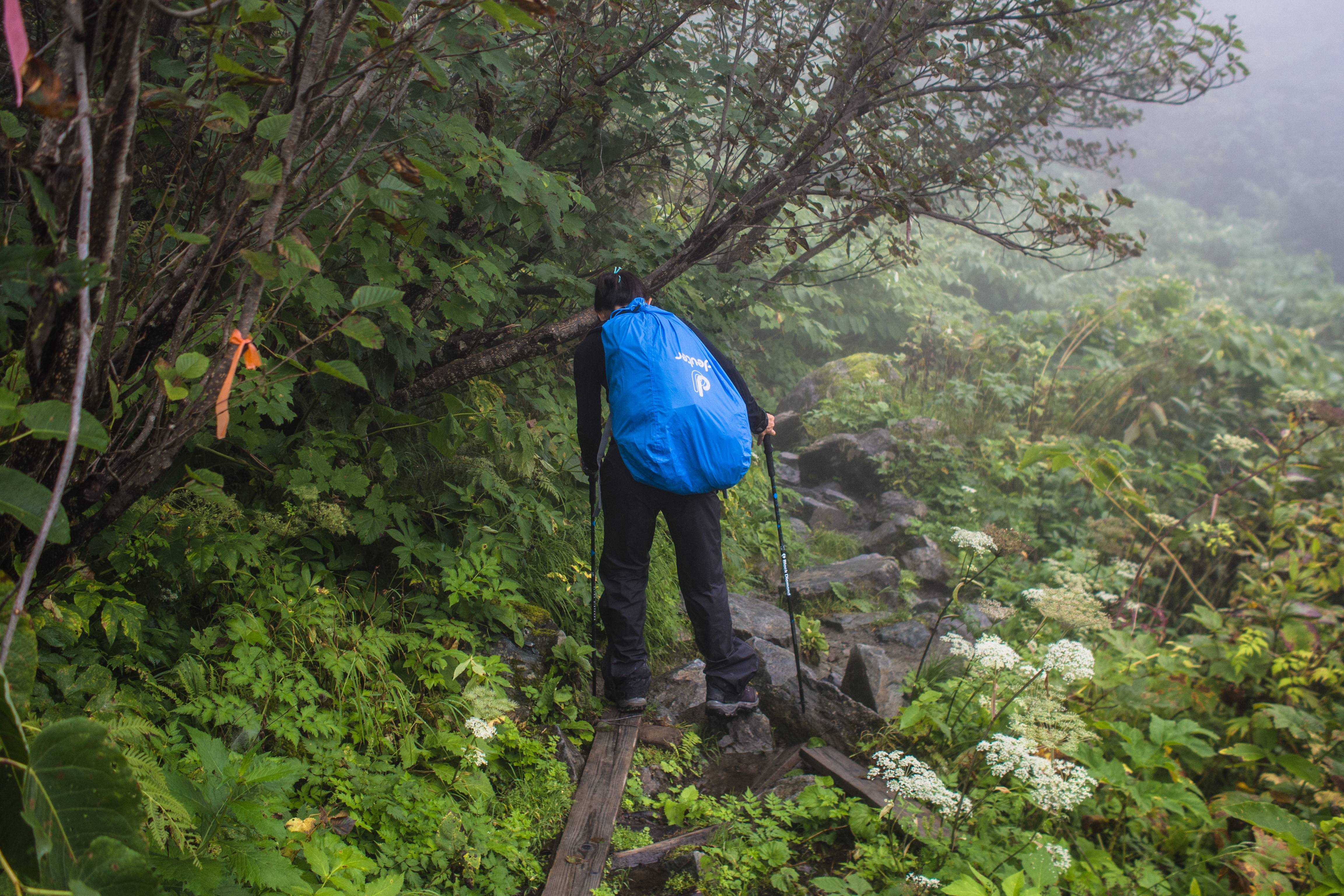 It was a long uphill climb towards Korengesan 小蓮華山(2769m), very scenic even though marred by mist. A little after we passed Sangokuzakai 三国境 (2751m), at the junction where a trail led to Yukikura Dake 雪倉岳 (2 hours), the rain came down on us – hard. We walked steadily for 1 hour in the pouring rain, reaching Mt Shirouma 白馬岳 (2932m) without much trouble. But there was no sense of elation because there’s not a thing to be seen – only dark, heavy raindrops.
