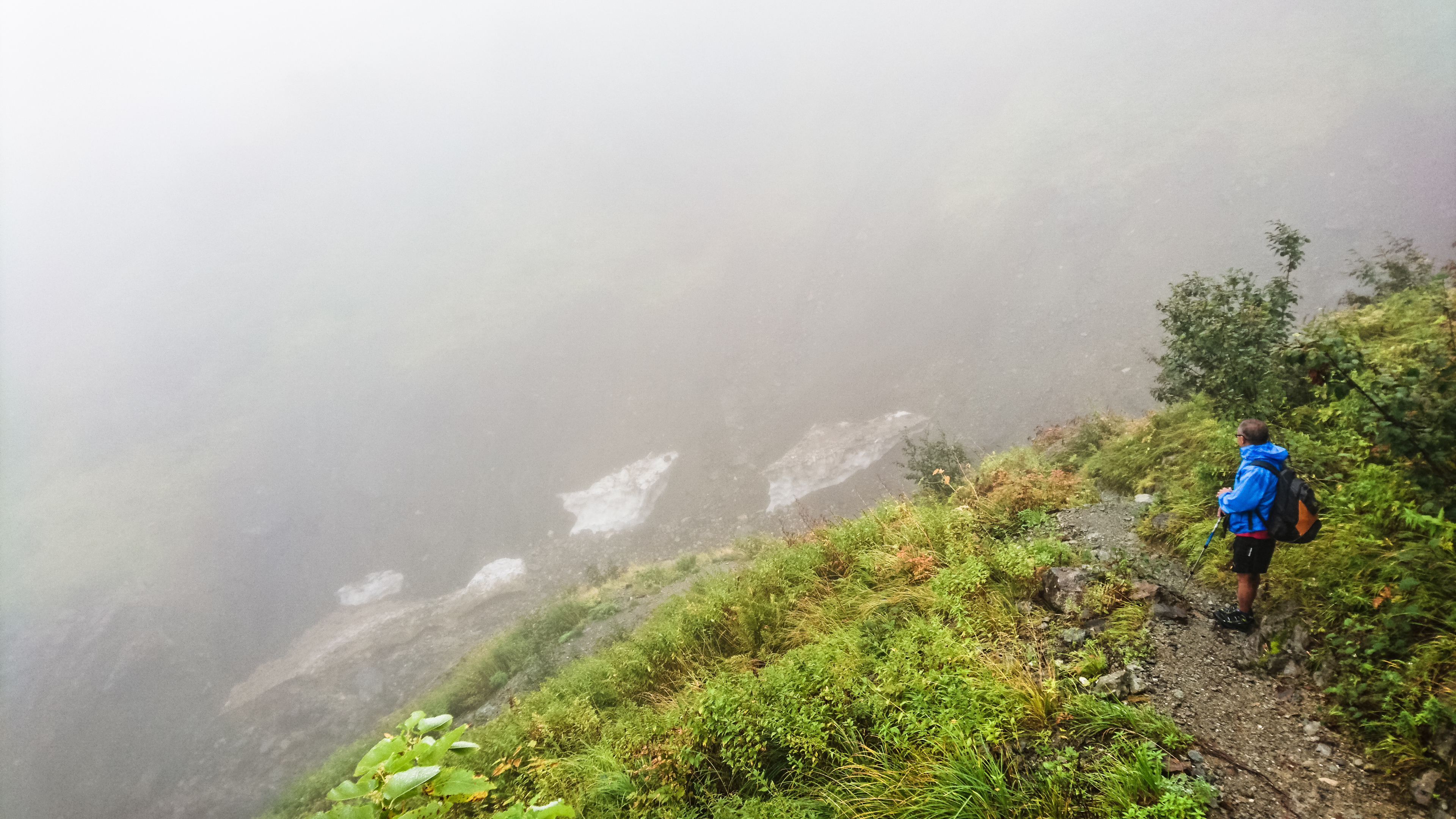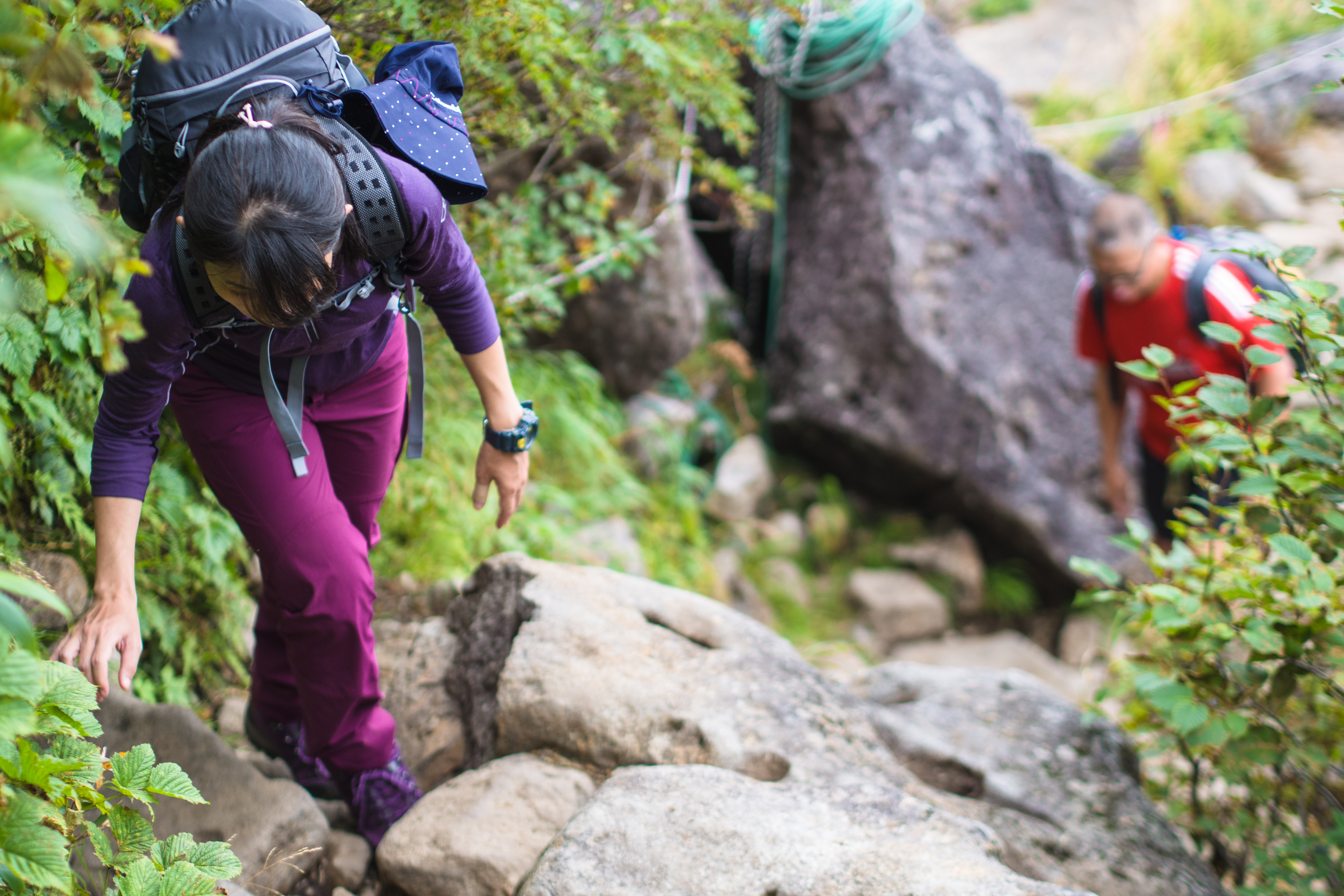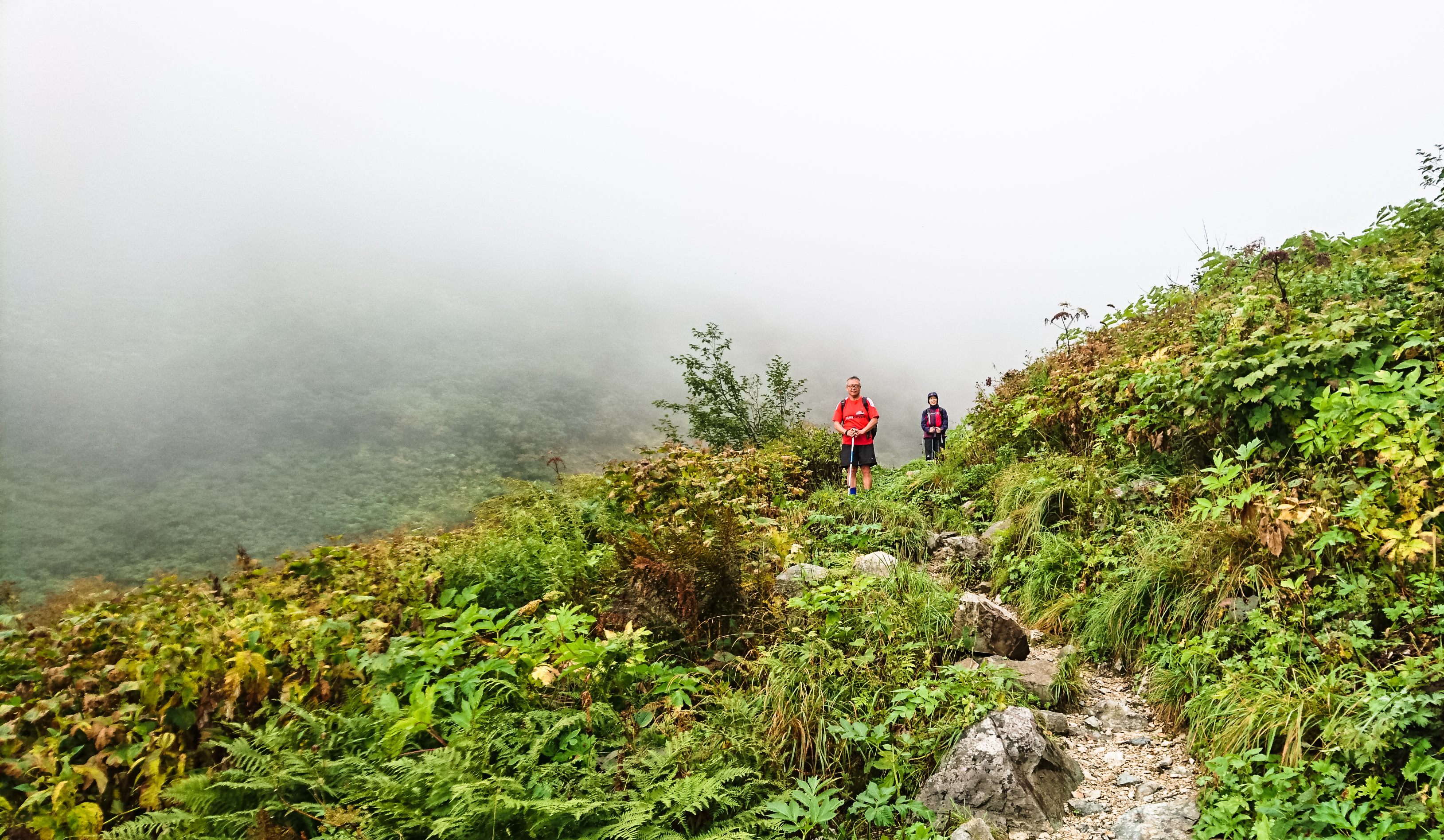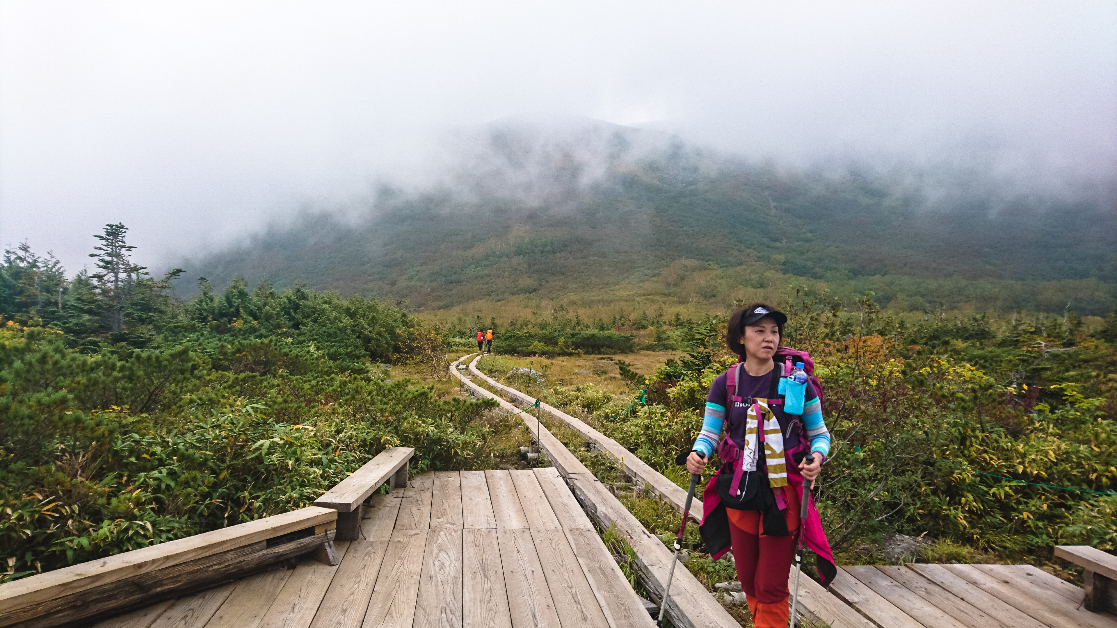 We hiked up Shirouma Yarigatake 白馬鑓ヶ岳 (2903m) (because the boss said we should), then staggered down from its peak, hoping to reach the split junction to Yari Onsen soon (there’s an alternative trail that circles around Yarigatake, but it wouldn’t have been fun right?). We still couldn’t see very far and only saw the trail markers when we were just a few paces away. There were 2 hikers coming up from Yari direction, one wearing a thin grey t-shirt, holding an umbrella. The thoughts that went through our heads then: Wow, very strong; can that umbrella fend off that wind? Is that a magic umbrella?