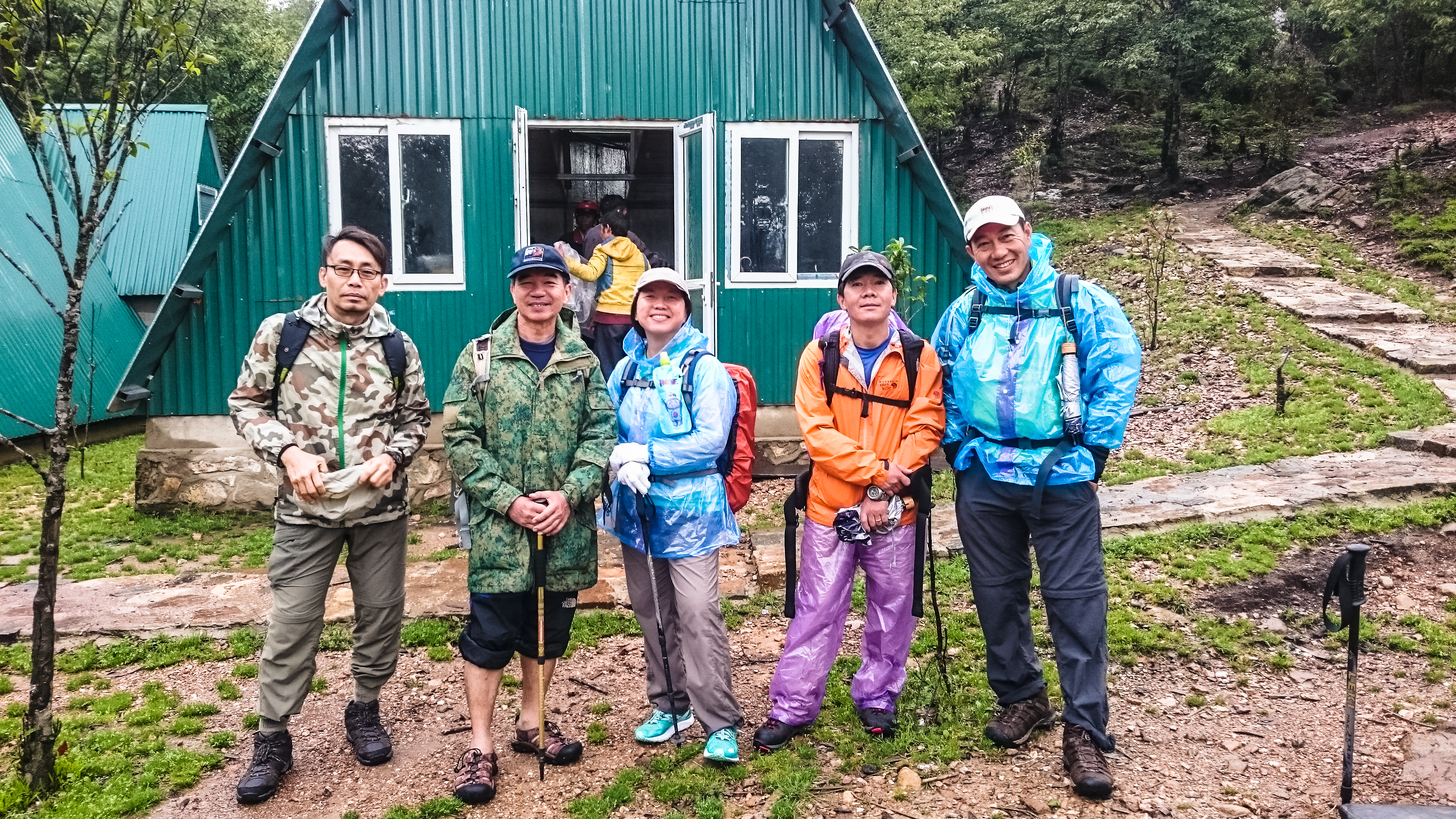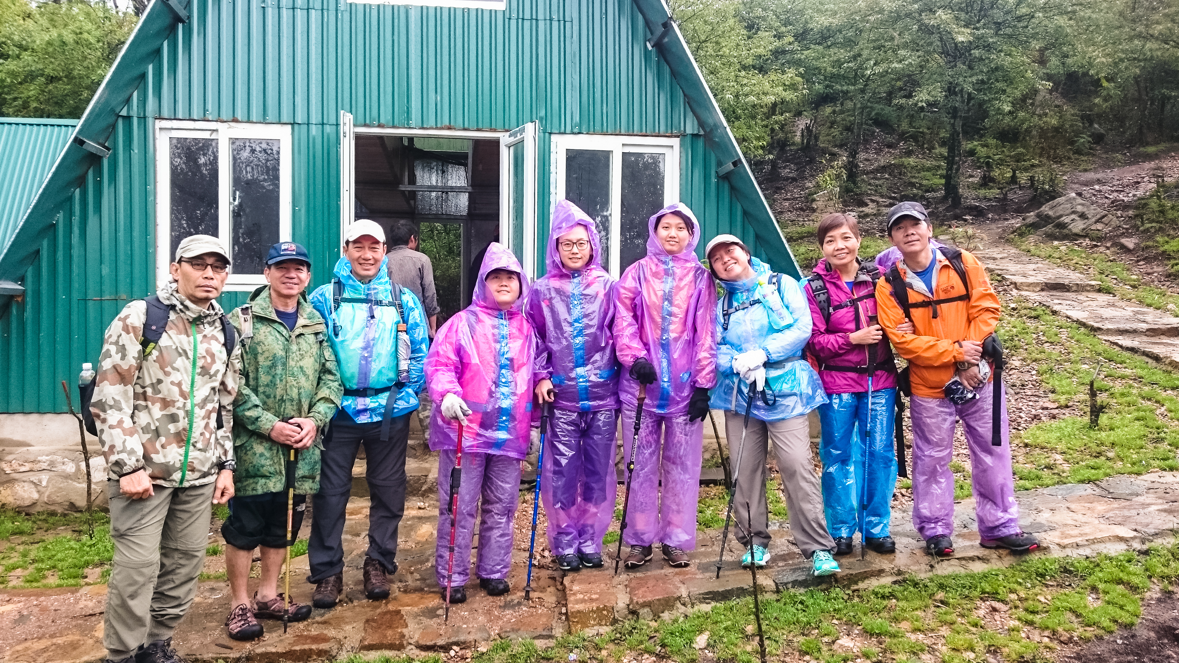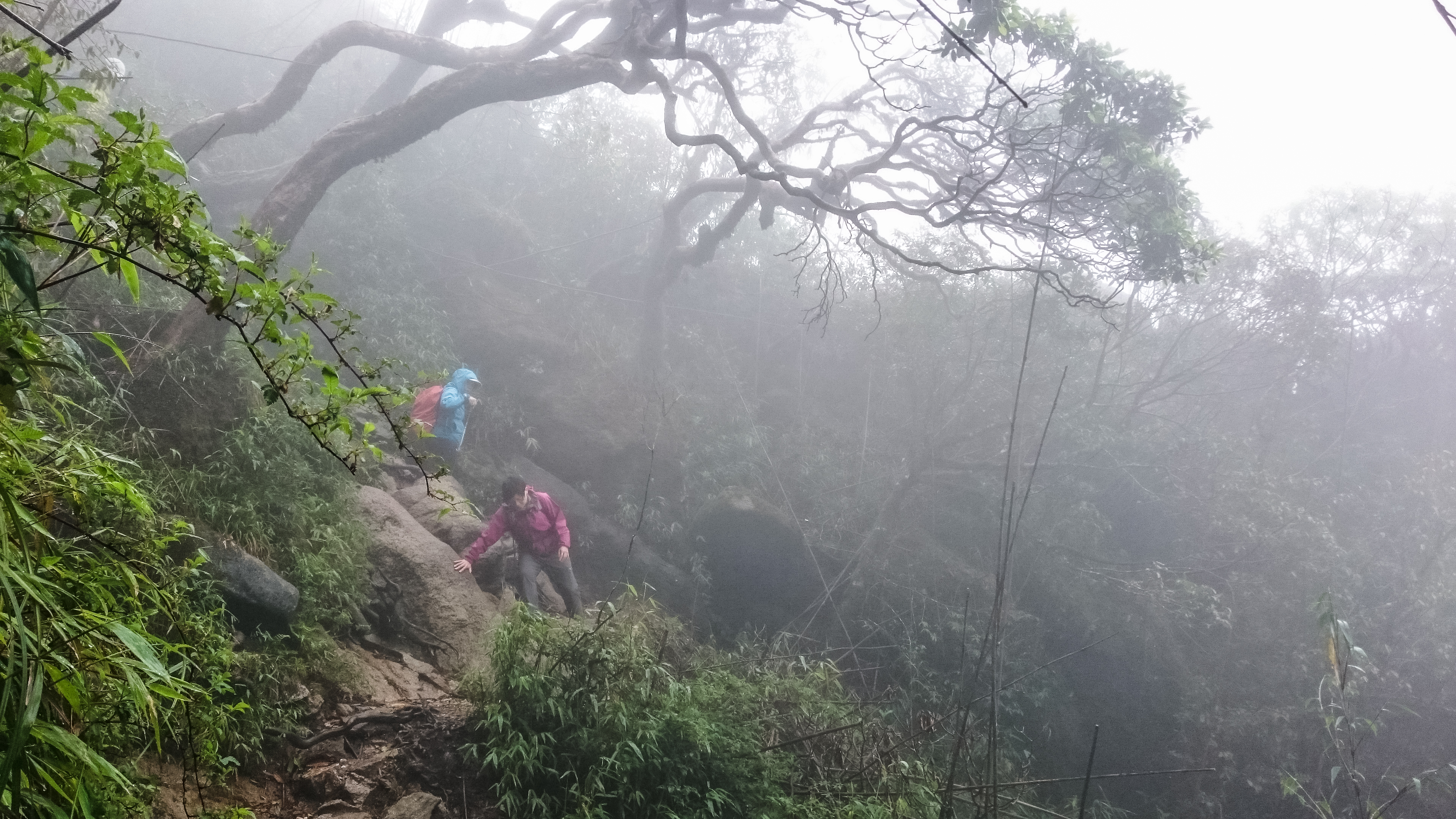 After hanging around the breakfast area for a long time and eating breakfast twice (futile wait for rain to stop), we finally checked out and headed to the tour office to deposit our luggage and pick up the trekking crew. Then it was a 20-minute ride to the trailhead (1900m). The van drove deeper and deeper into the fog – too late to get cold feet – before it passed a big touristy arch, then stopped in front of a white bungalow (white house – the park office) . At 940am, we set off for what’s going to be a miserable journey – but we didn’t know yet.