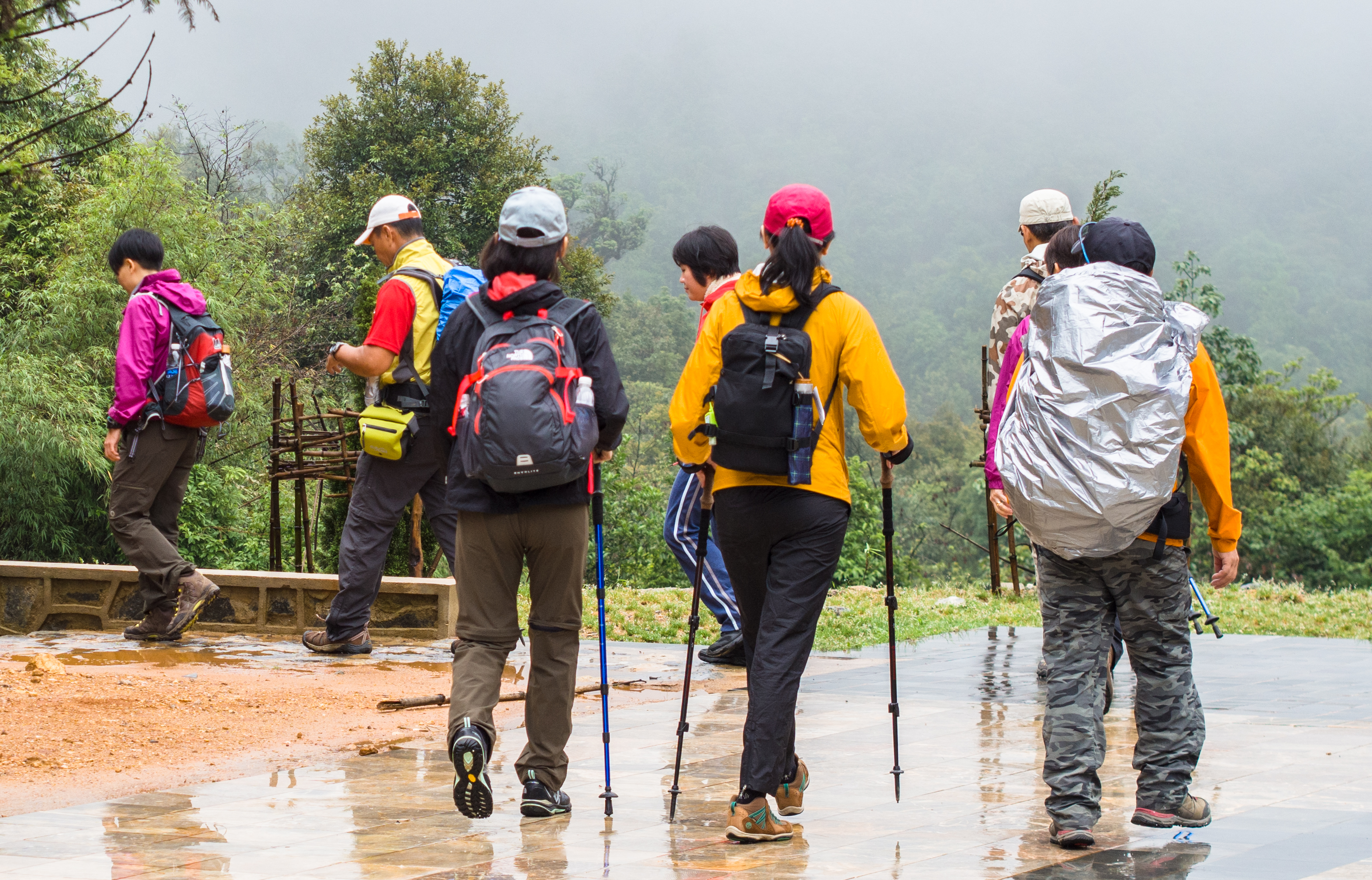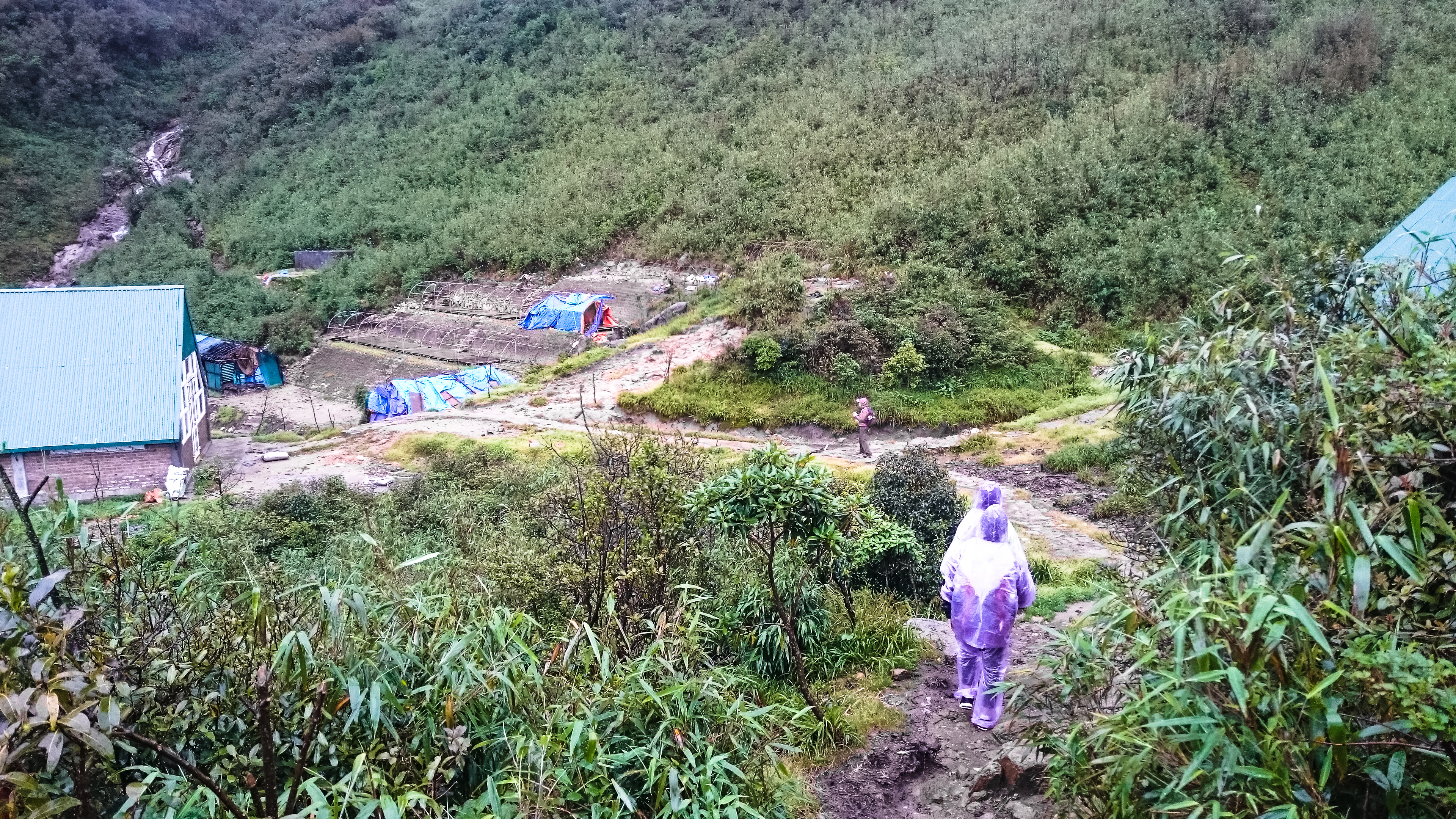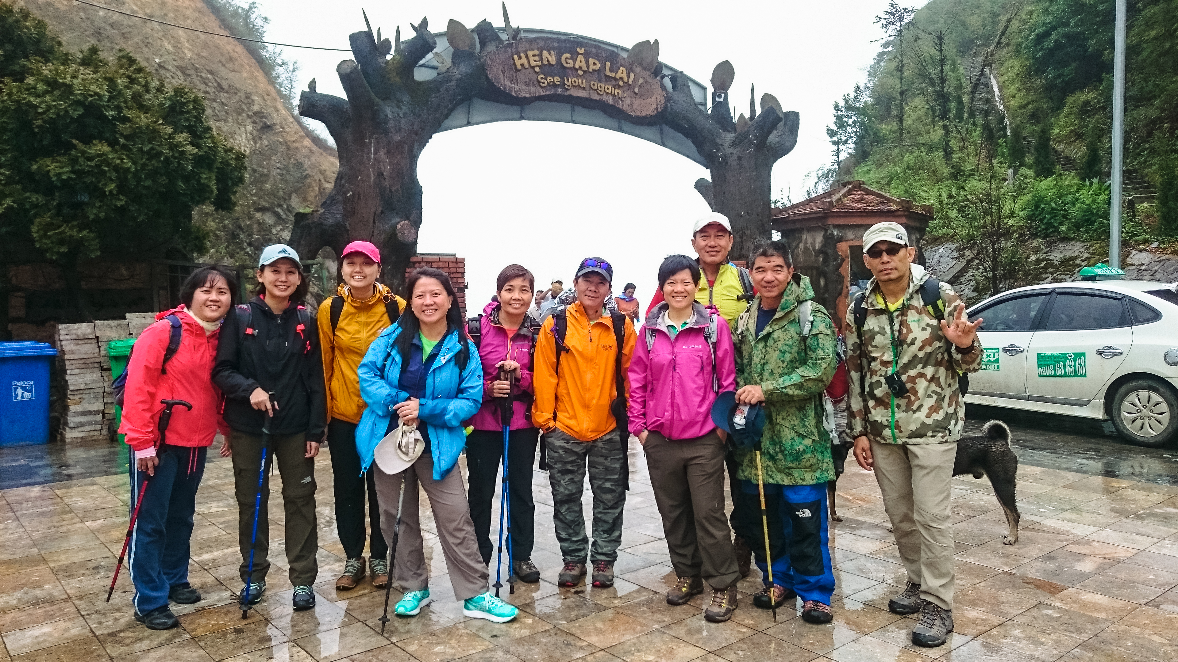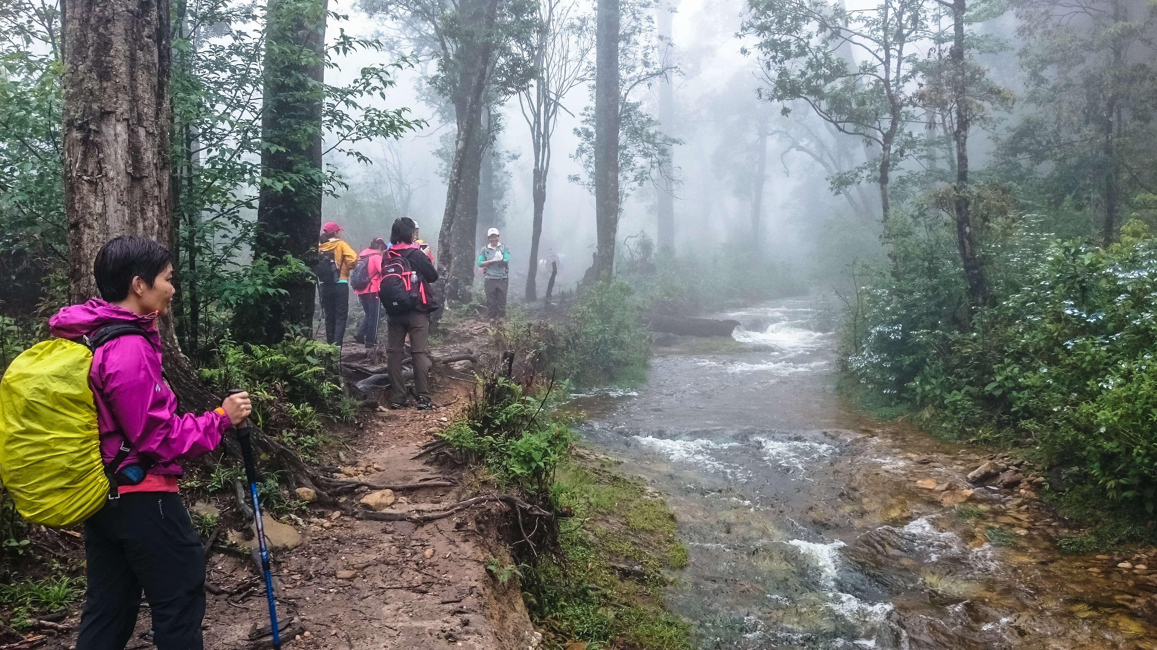 After hanging around the breakfast area for a long time and eating breakfast twice (futile wait for rain to stop), we finally checked out and headed to the tour office to deposit our luggage and pick up the trekking crew. Then it was a 20-minute ride to the trailhead (1900m). The van drove deeper and deeper into the fog – too late to get cold feet – before it passed a big touristy arch, then stopped in front of a white bungalow (white house – the park office) . At 940am, we set off for what’s going to be a miserable journey – but we didn’t know yet.