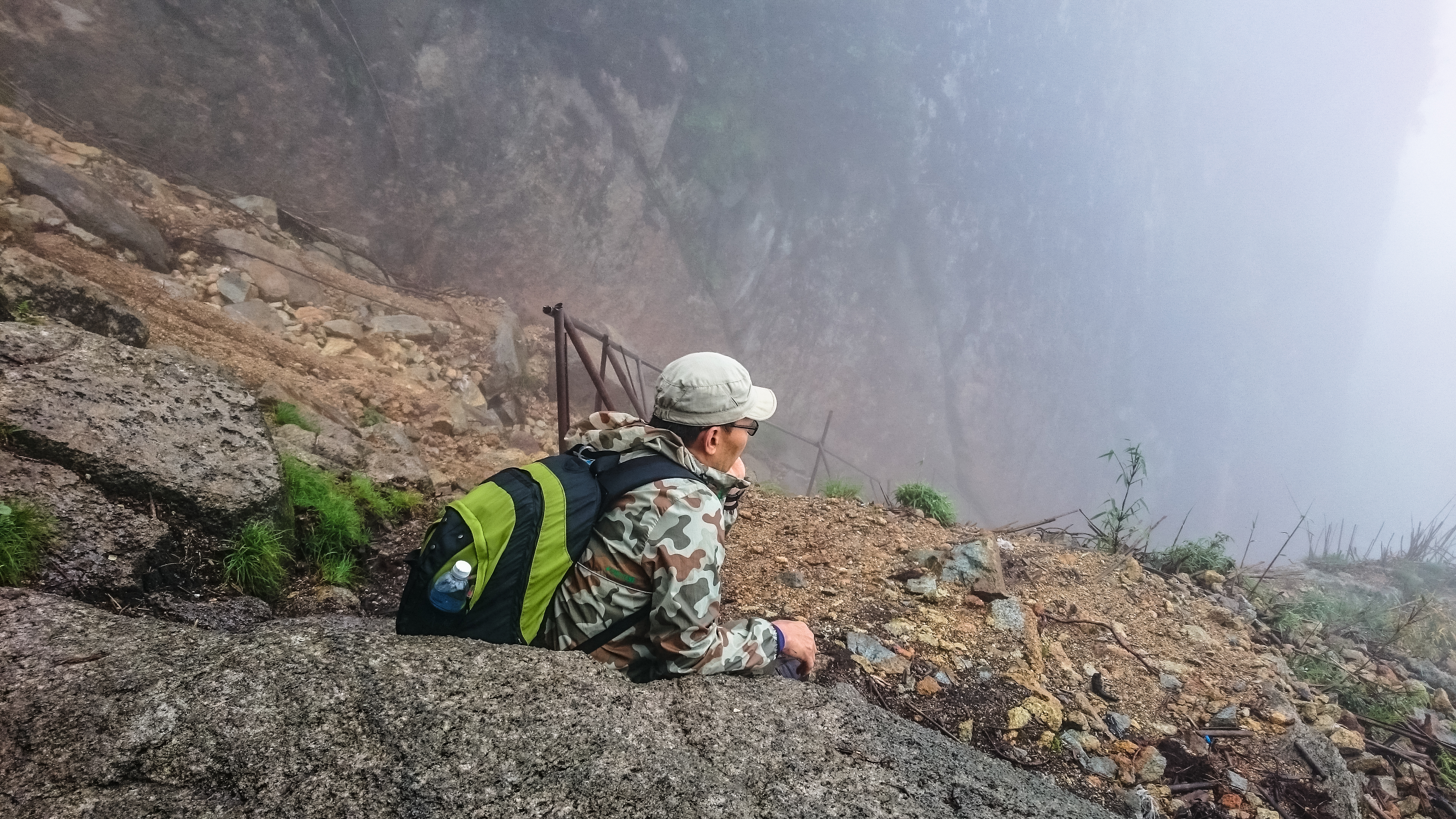 It was still raining of course when we left the campsite at 7.10am, Our pace unhurried, secured in the knowledge that we were a mere 2 hours from the end of our ordeal. It wasn’t an easy trail; we slid down long sections of steep slippery rocks, walked along narrow ledges, climbed up long metal ladders that felt flimsier than the ones the day before. The climax was this steep rock face riddled with big loose rocks that we had to tackle in order to get to the cable car platform.