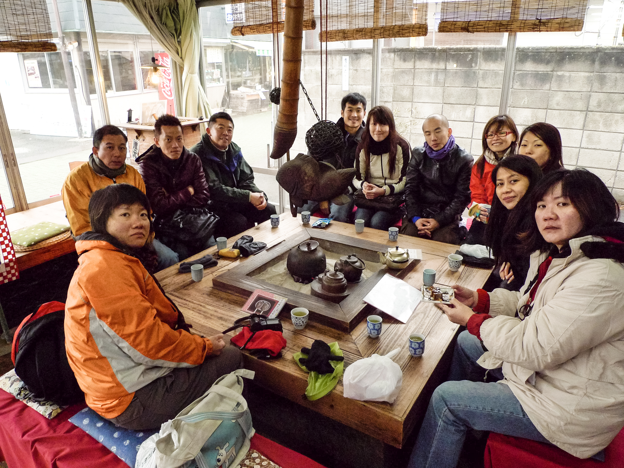 We beat a hasty retreat when it started to snow and huddled into Yawataya 八幡家 for hot coffee/dessert. The open hearth in the shop was the perfect gathering place for our group of 13.