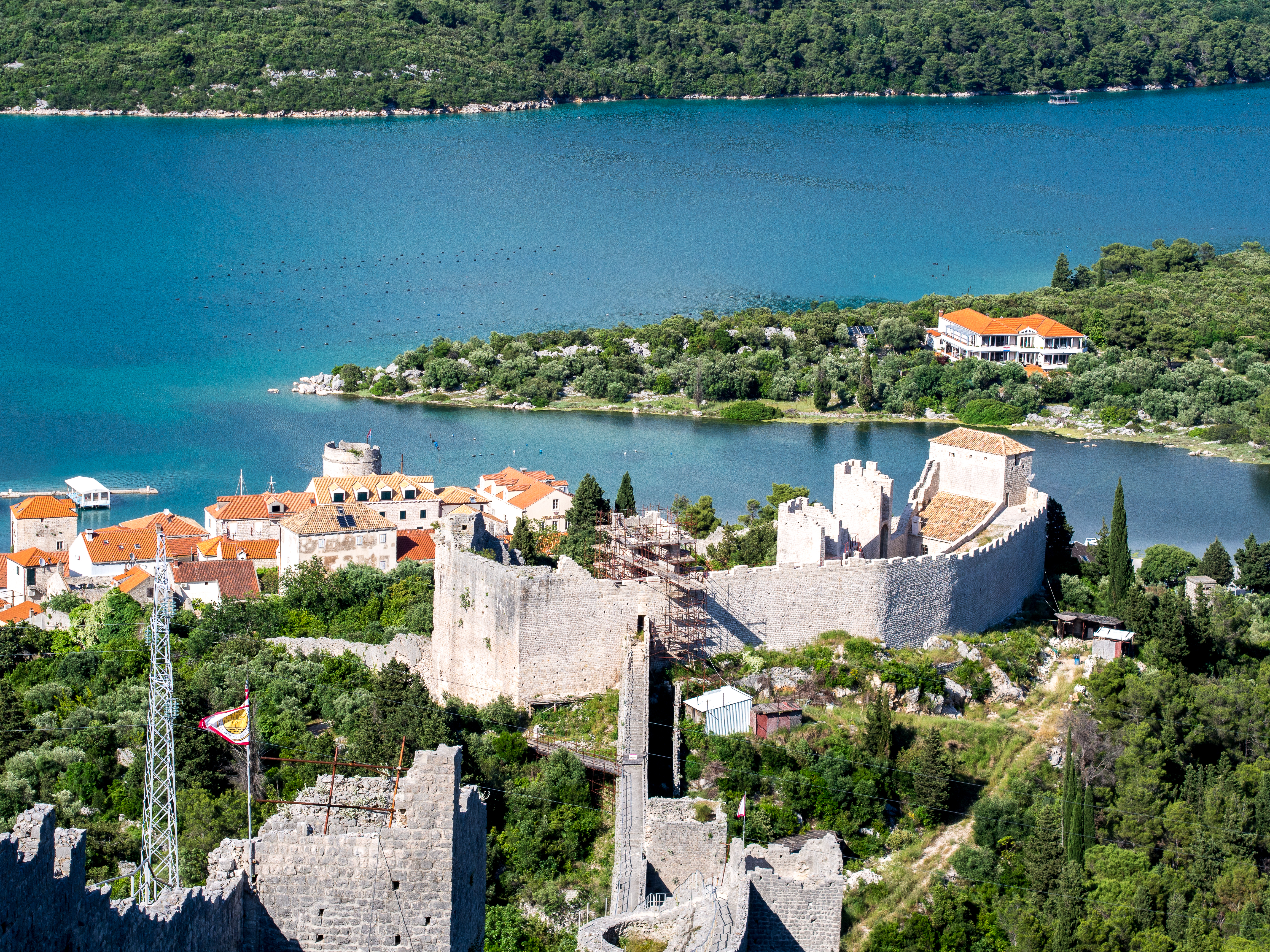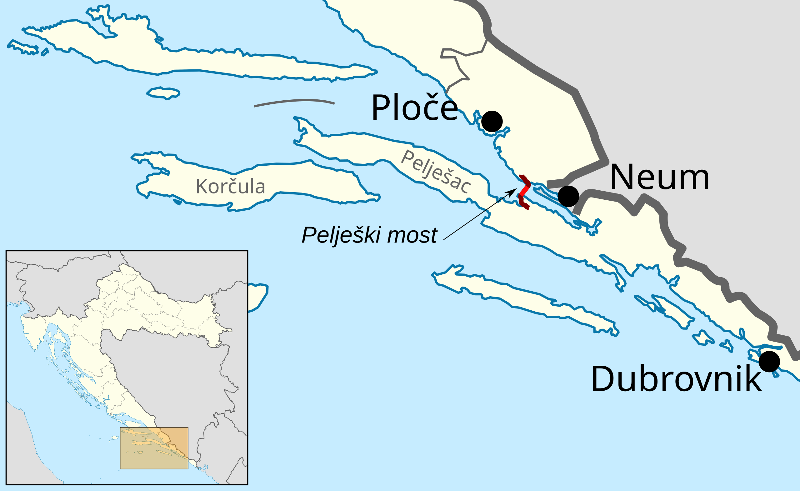 Ston was located on the Pelješac peninsula and connected to the rest of Croatia by the Pelješac Bridge which was only completed in 2022. Before that, travelers from either side of Croatia had to pass through a 9km stretch of Bosnia-Herzegovina’s coast (and two border crossings) to reach it or cross over to the other side (images below from Wikipedia).