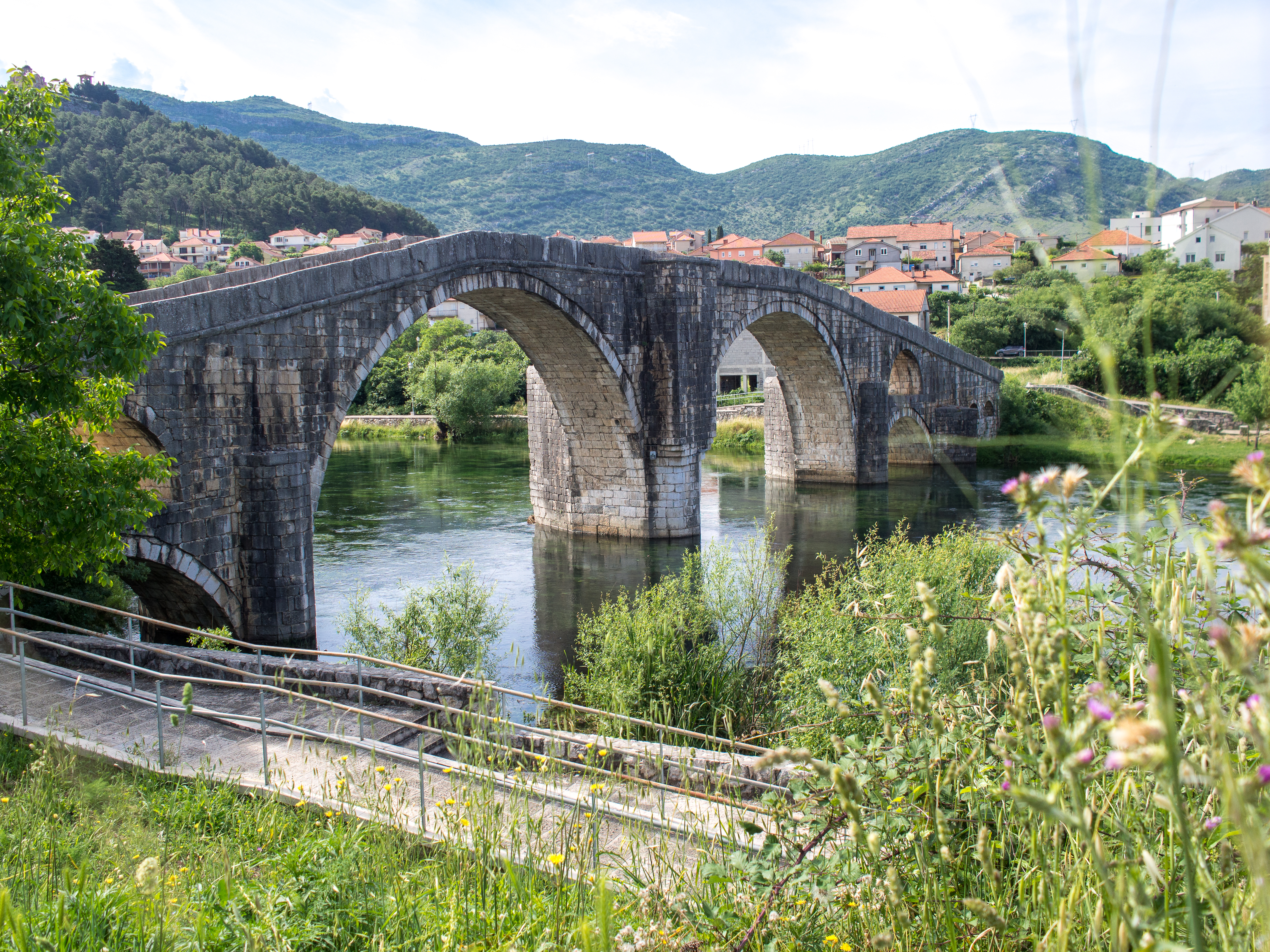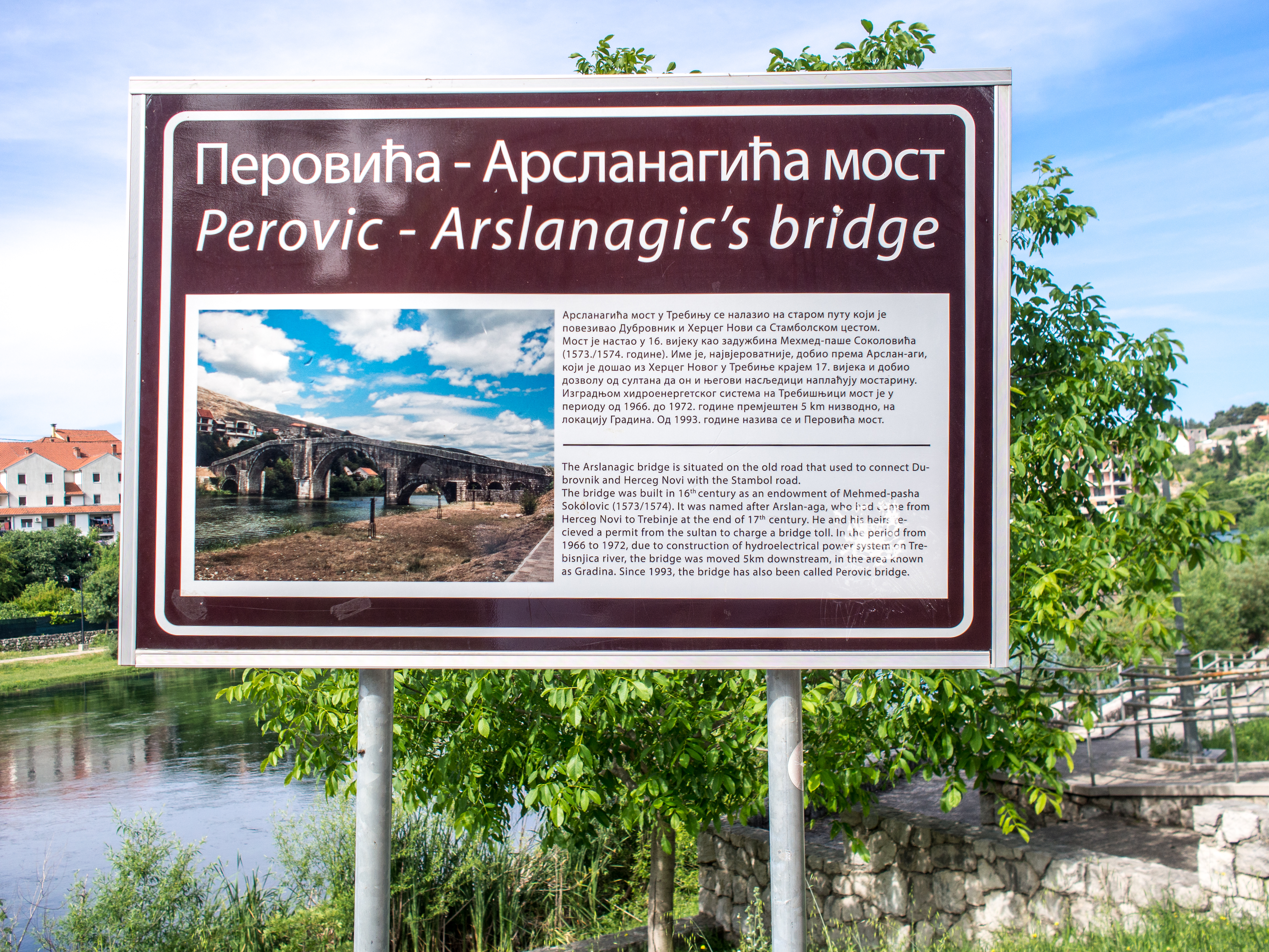 It is an Ottoman-era stone bridge built in 1574 over the Trebišnjica River. In the 1960s, due to the construction of a hydroelectric dam, the bridge was disassembled stone by stone and reconstructed 5km upstream at its current location.